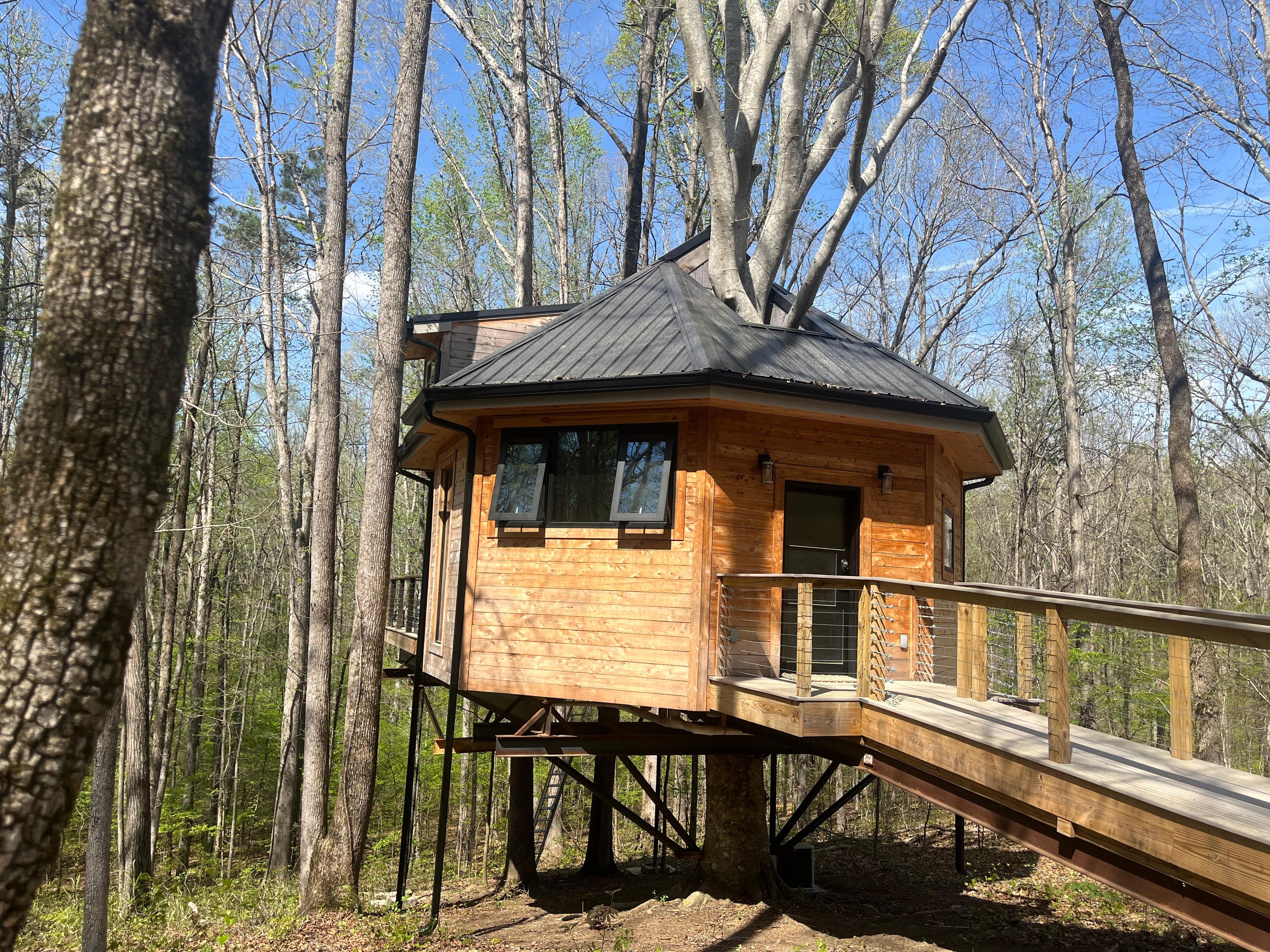Immerse in nature from the luxurious comfort of this unique treehouse tucked away with 22 acres, privately nestled in old growth forest. The Beech Retreet treehouse is a full home nestled in the trees! Inside, enjoy a full kitchen, a full bathroom, a sleeping loft with 2 queen beds, and an elegant living space with a smart TV and pull out king size bed. Don't forget to open the window and admire the beech tree supporting your magical stay! Combine indoors and out as the luxurious living room opens completely to the outdoor living room deck, boasting 3 more support trees. Here you'll enjoy a hot/cold tub, full dining table, fire pit, and comfy outdoor furniture, all surrounded by twinkle lights, candles, lanterns, and tree canopy. Venture into the old growth forest surrounding Beech Retreet Treehouse to privately enjoy trail hikes, beachy creek access, and natural waterfalls. If you prefer a golf cart to access these sights and sounds, one can be made available for your use.