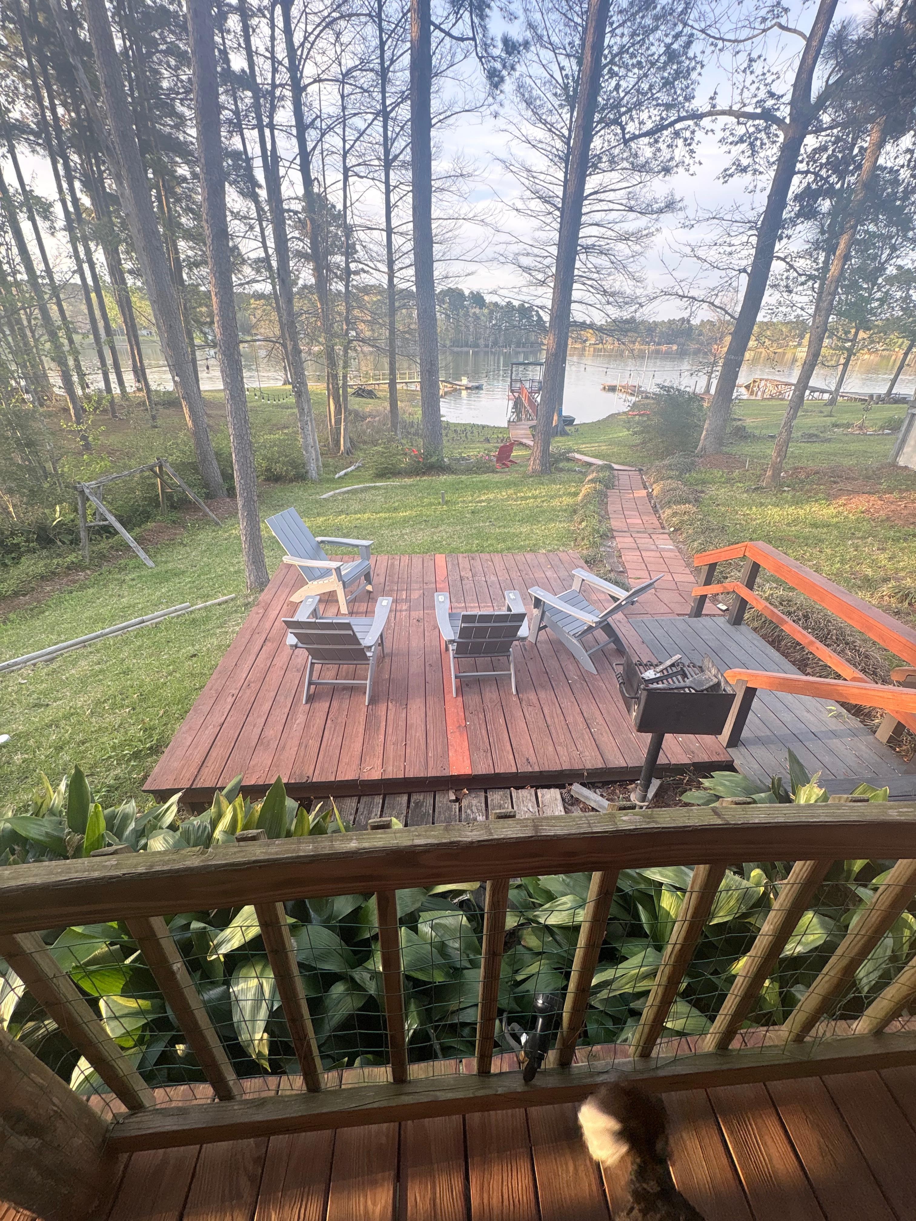 Cedar Cabin on Indian Creek in Toledo Village section 6 Fishers Point. Located in a quiet neighborhood on South Toledo Bend, Texas, this lakefront cedar cabin is the perfect place to get away from it all. You can relax on the covered porch, or on the open sundeck, and enjoy the panoramic views of the lake. Pets are welcome, with $75 pet fee. Large covered carport with electricity. Walkway to fishing dock with electricity and covered end, floating swim platform with ladder. Kayaks for guest use, bring your floatation devices! Back deck is 'fenced' with latched gates to prevent