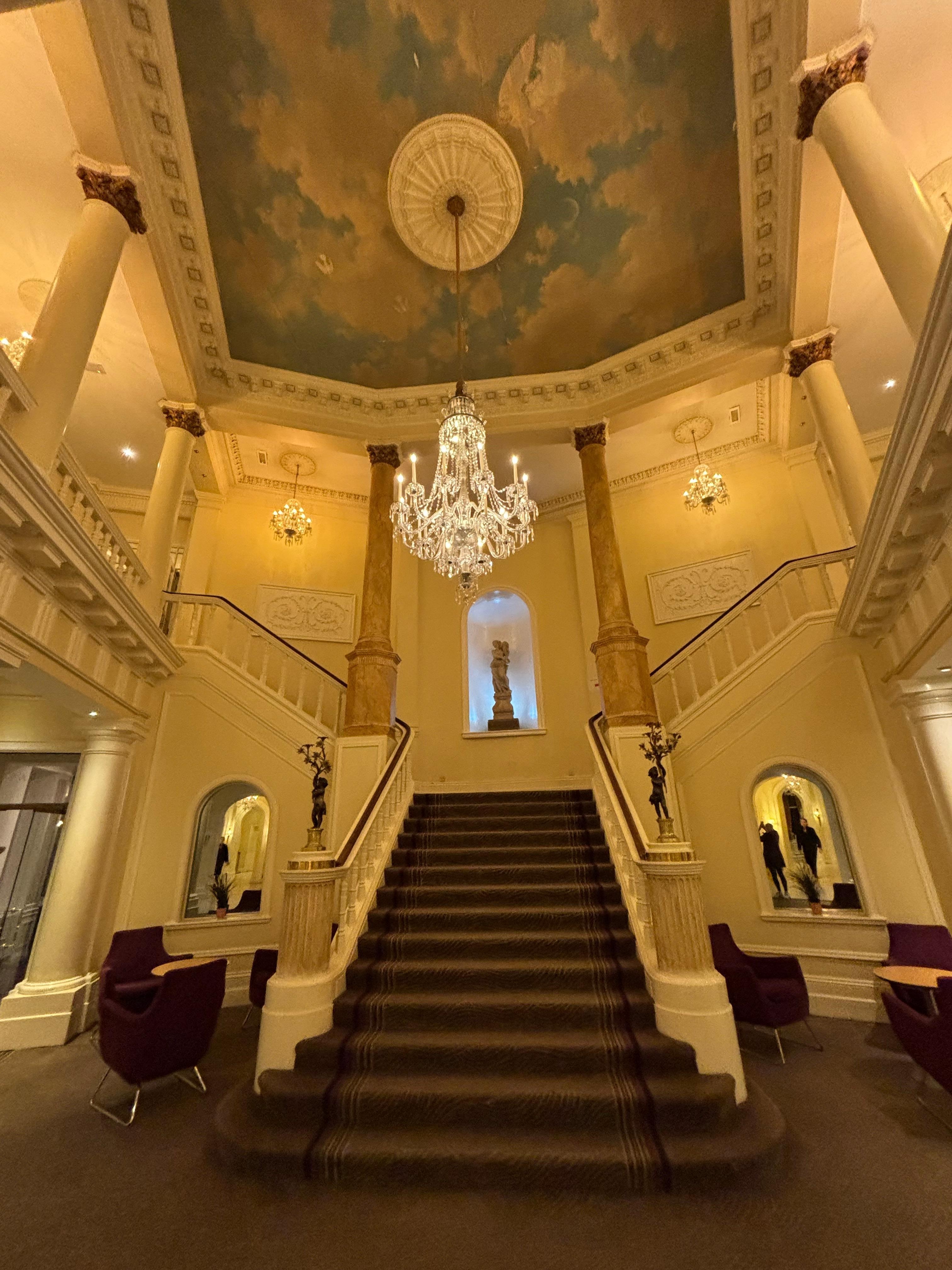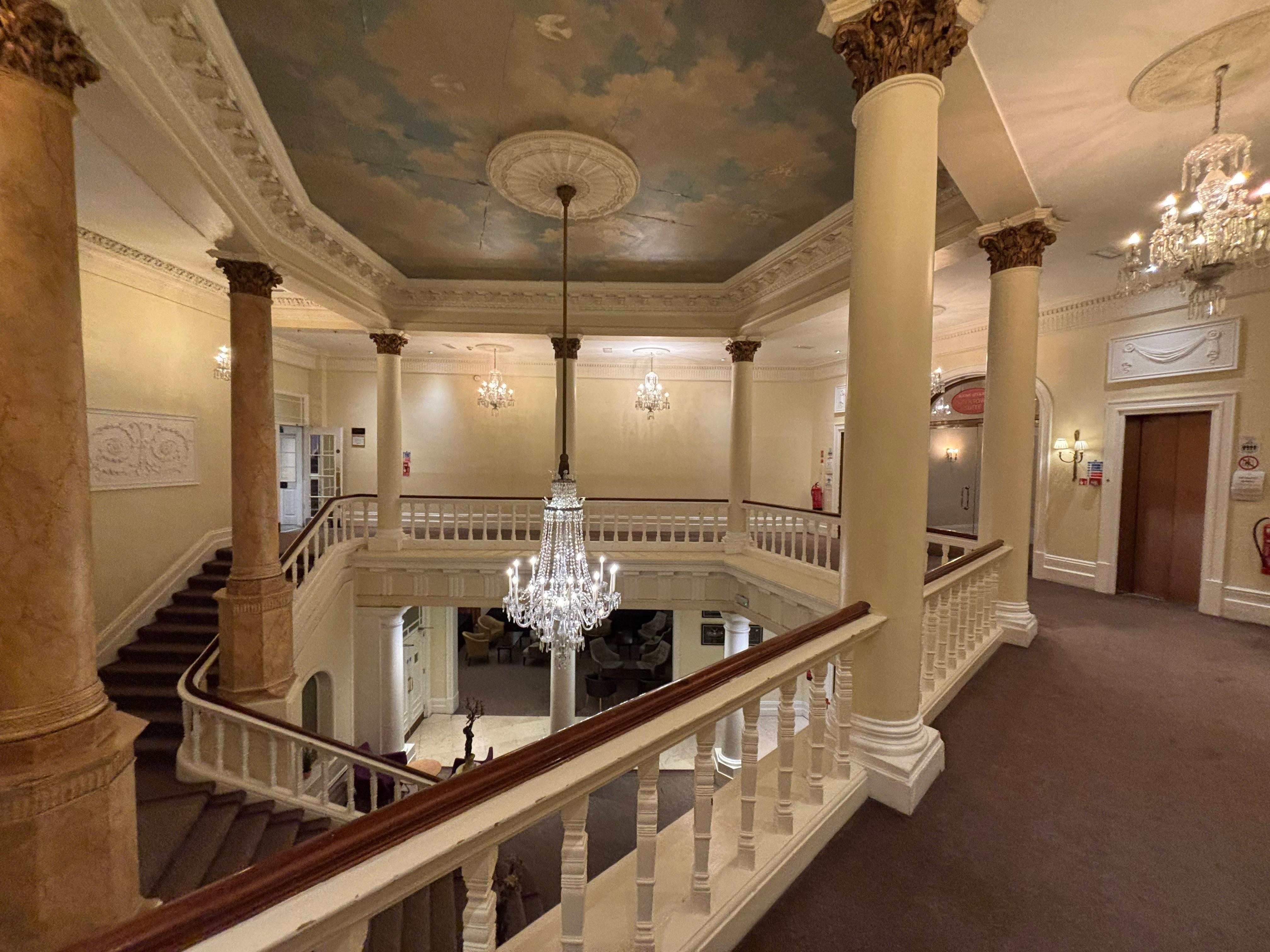 It has great character with a beautiful staircase and chandelier. It is being renovated and is in need of some updating. Staff was lovely. Parking referenced was closed, there is a convenient lot across the street but requires payment.