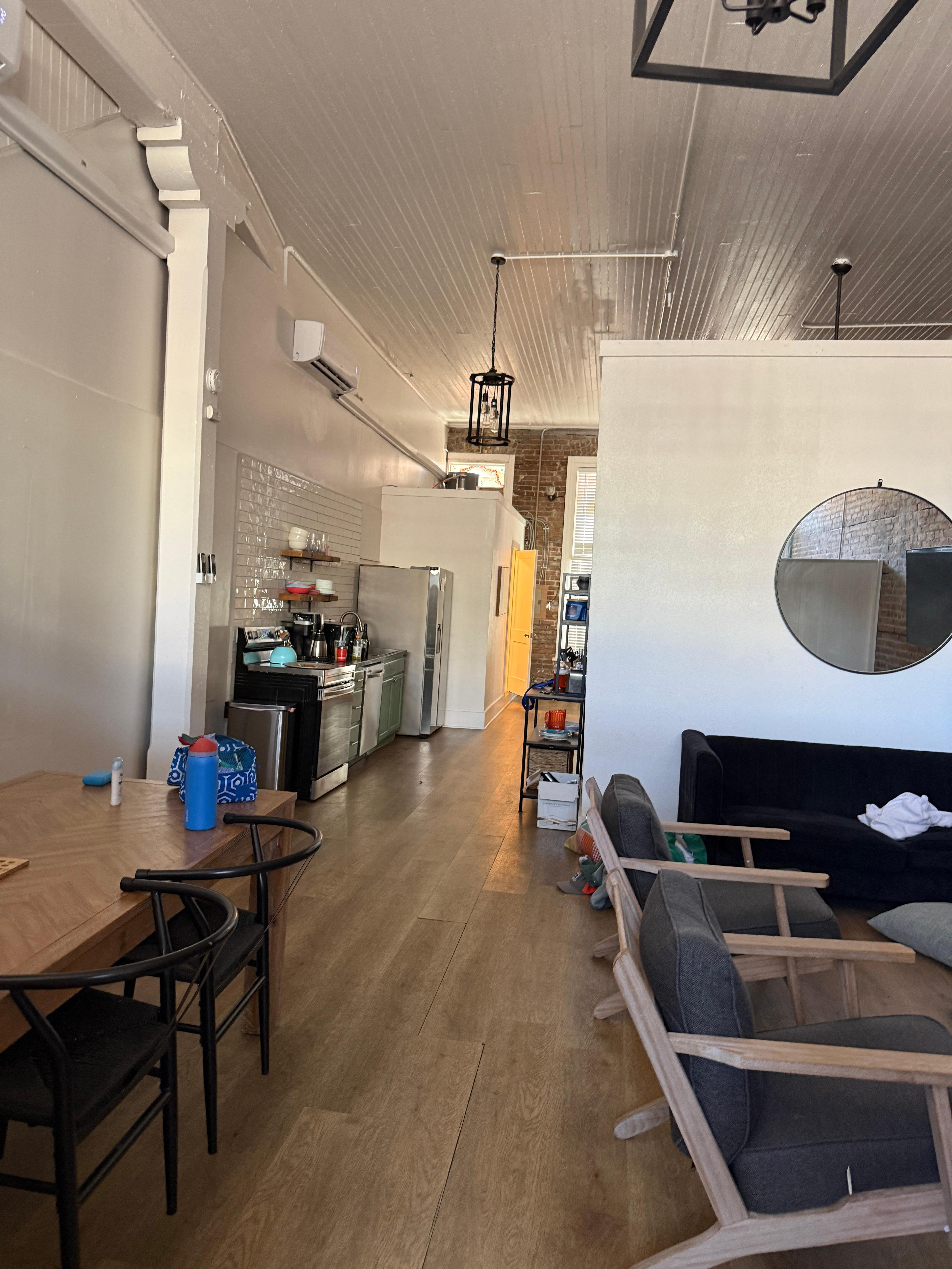 As you enter, a dedicated game room filled with arcade games, a foosball table, and comfy seating beckons for some friendly competition or a relaxing social hour. French doors lead you into the heart of the loft, where a light-filled living area with a flat screen TV provides a perfect spot to unwind after a day of exploration. The adjoining galley kitchen is well-equipped for whipping up meals, and continues the flow towards the private quarters.