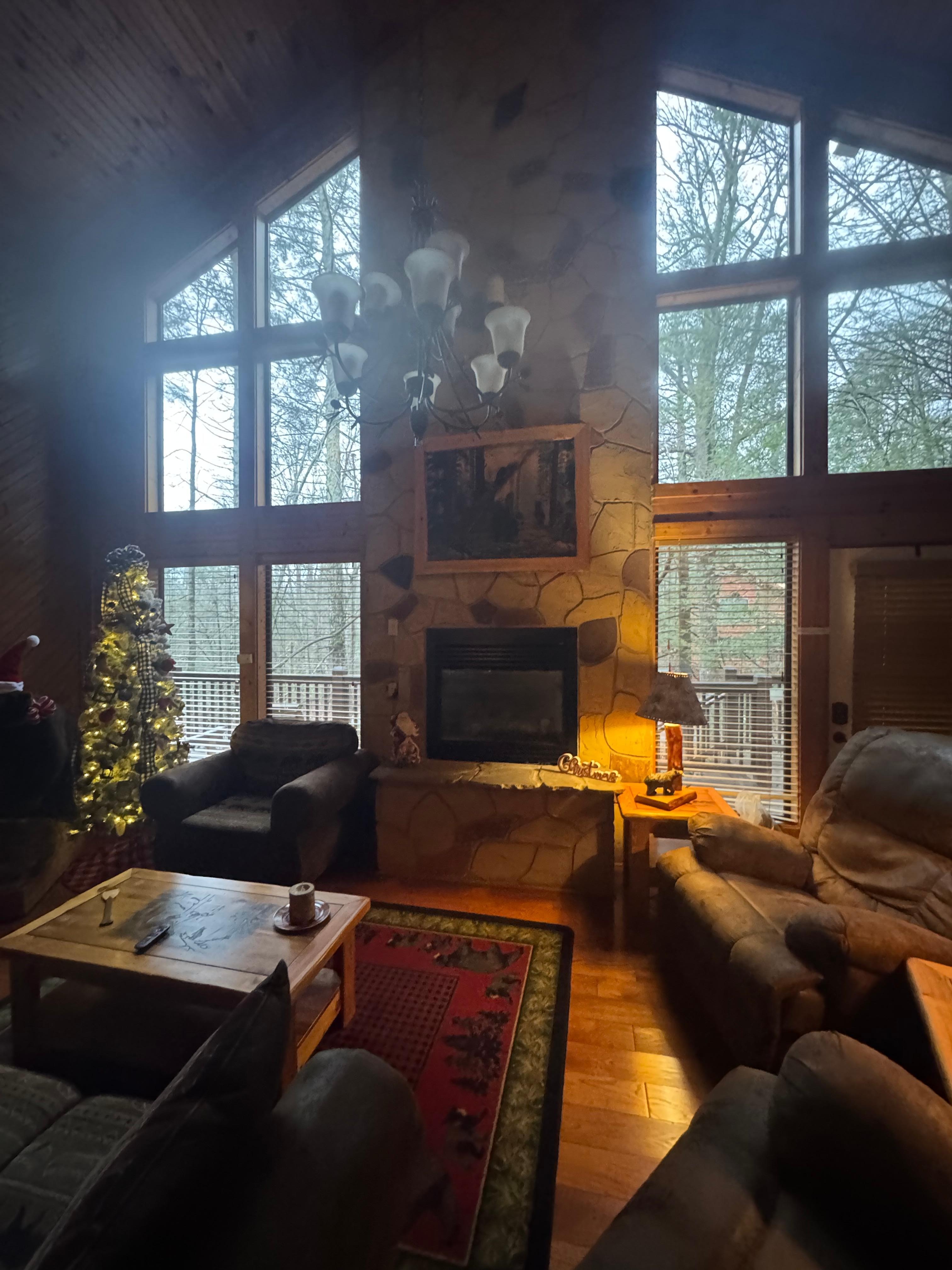 As you step into Lazy Bear, you'll be immediately delighted by its beautiful living room featuring a striking floor-to-ceiling stone fireplace and comfortable furnishings, all complemented by a large flat-screen TV for movie nights (with Roku streaming services only) or engaging conversations with loved ones.