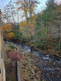 Location of this condo was perfect! We were able to get out and walk everywhere in Gatlinburg. It was one of the most crowded times in the city so it was great to park and not have to move our car. I loved that we were on the end of the "strip" so it was a hit quieter. The condo itself is dated. But, it has everything you need to have a great trip. I wish it were warmer during our stay so we could've enjoyed the balcony overlooking the creek. It was beautiful. We traveled with our dog. It was a bit difficult to find a good place for a potty break. Had to trek a bit off property to find a grassy spot.