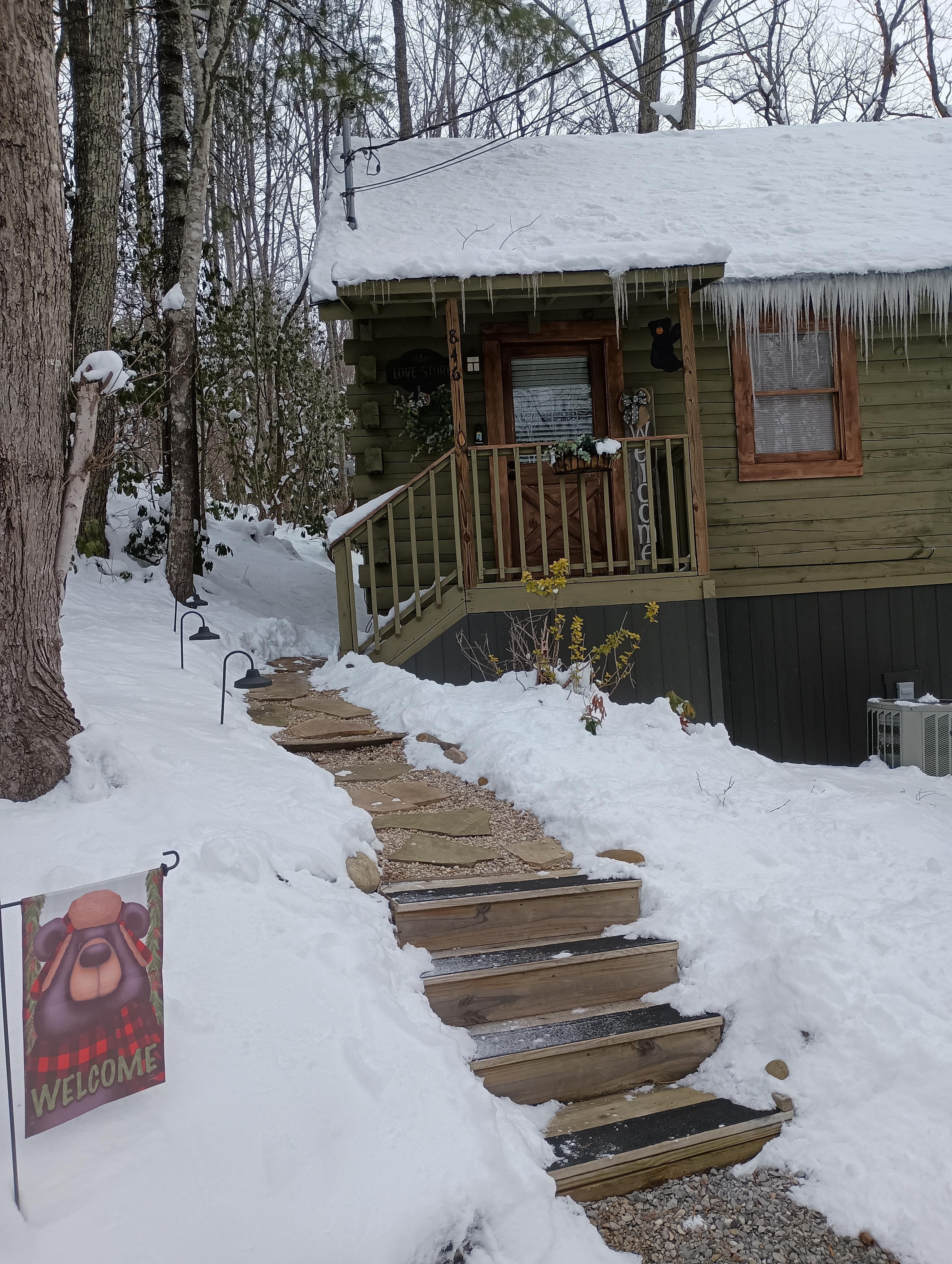 The cabin is very secluded and private, with lots of trees that surround the property. There is one Blink Camera installed at the entrance/driveway for your protection and ours. It also has a mountain view, not as great when leaves are out.. Private deck with large hot tub, pool table, wood burning fireplace, firewood provided in Winter months, big screen TV with cable and Roku, unique Bubbler Jukebox (decoration only, however the bubbler does function) Vizio sound bar added for music located on TV Stand, fully furnished kitchen and very romantic open loft master bedroom with king bed. Best of all it has a red heart shaped Jacuzzi that sits under a skylight and when you look up, you can see the stars and moon on a clear night.