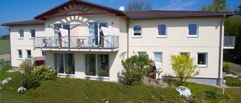 The flat with its approx. 120 square metres is intended for up to 4 persons, it contains 1 bedroom with French bed (1.4 x 2 metres), SAT-TV, 1 bedroom with a large double bed (two mattresses 90x200), SAT-TV, 1 living room with SAT-TV, 1 dining room (winter garden with garden view), 1 bathroom with bathtub/shower, WC and bidet, a fully equipped kitchen (cooker with oven, dishwasher, refrigerator) and a hallway with a small picture gallery and seating furniture.