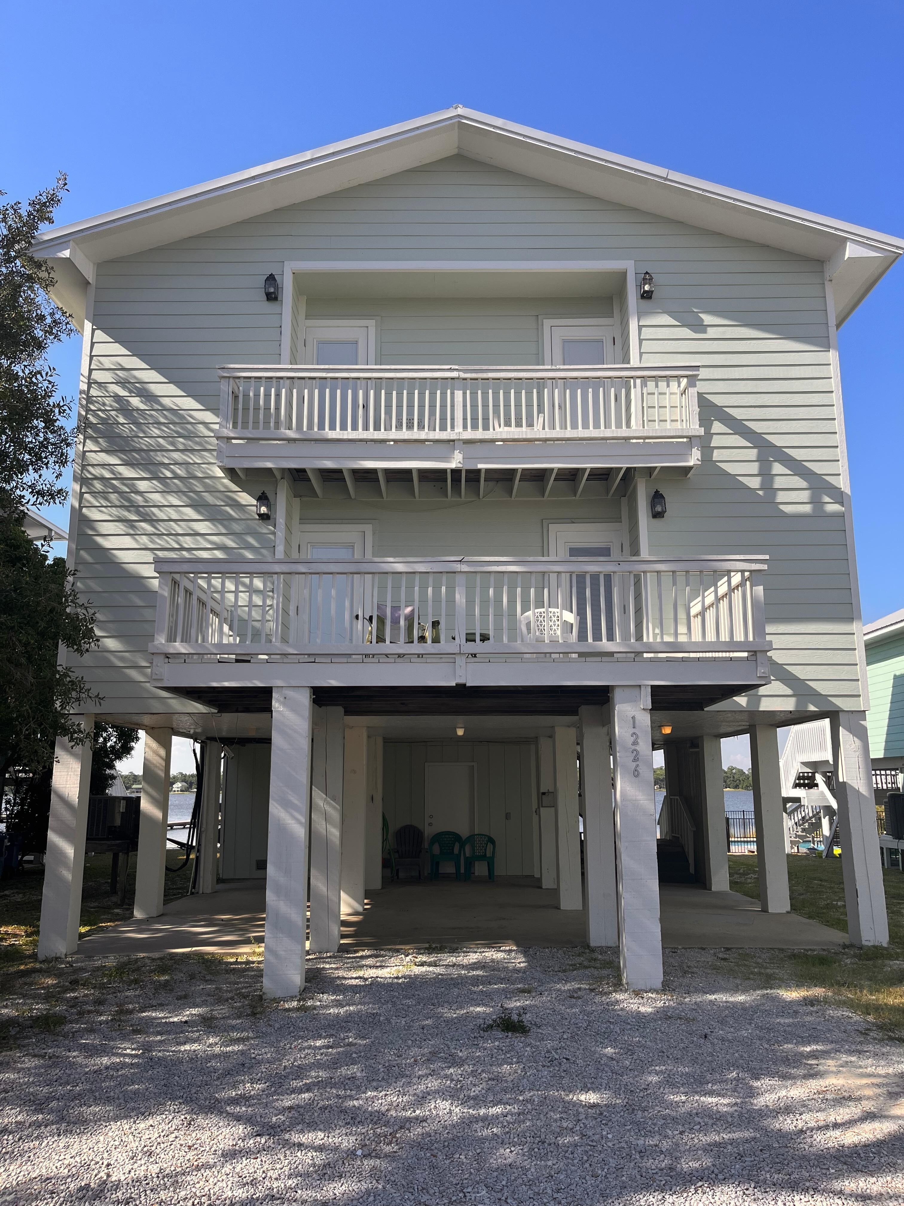 The Flip Side is a spacious waterfront home offering you the best of both water worlds. Situated on Little Lagoon, this lovely abode boasts both a screened-in waterfront porch and an open deck overlooking the recently constructed pier and stunning sunrises and sunsets. Fishing, swimming, and boating activities abound on this popular yet peaceful body of water. Plus, the beautiful beaches of the Gulf of Mexico are just a two-block walk away. This home is conveniently located near shopping, dining, and amusements, making The Flip Side a great getaway for the whole gang. The open floor plan including large living, dining, and kitchen areas – along with the four bedrooms, a bonus room, and ample parking – make it ideal for a family gathering. Tile flooring and freshly updated decor create a bright and beachy atmosphere perfect for a long vacation of both fun and relaxation.