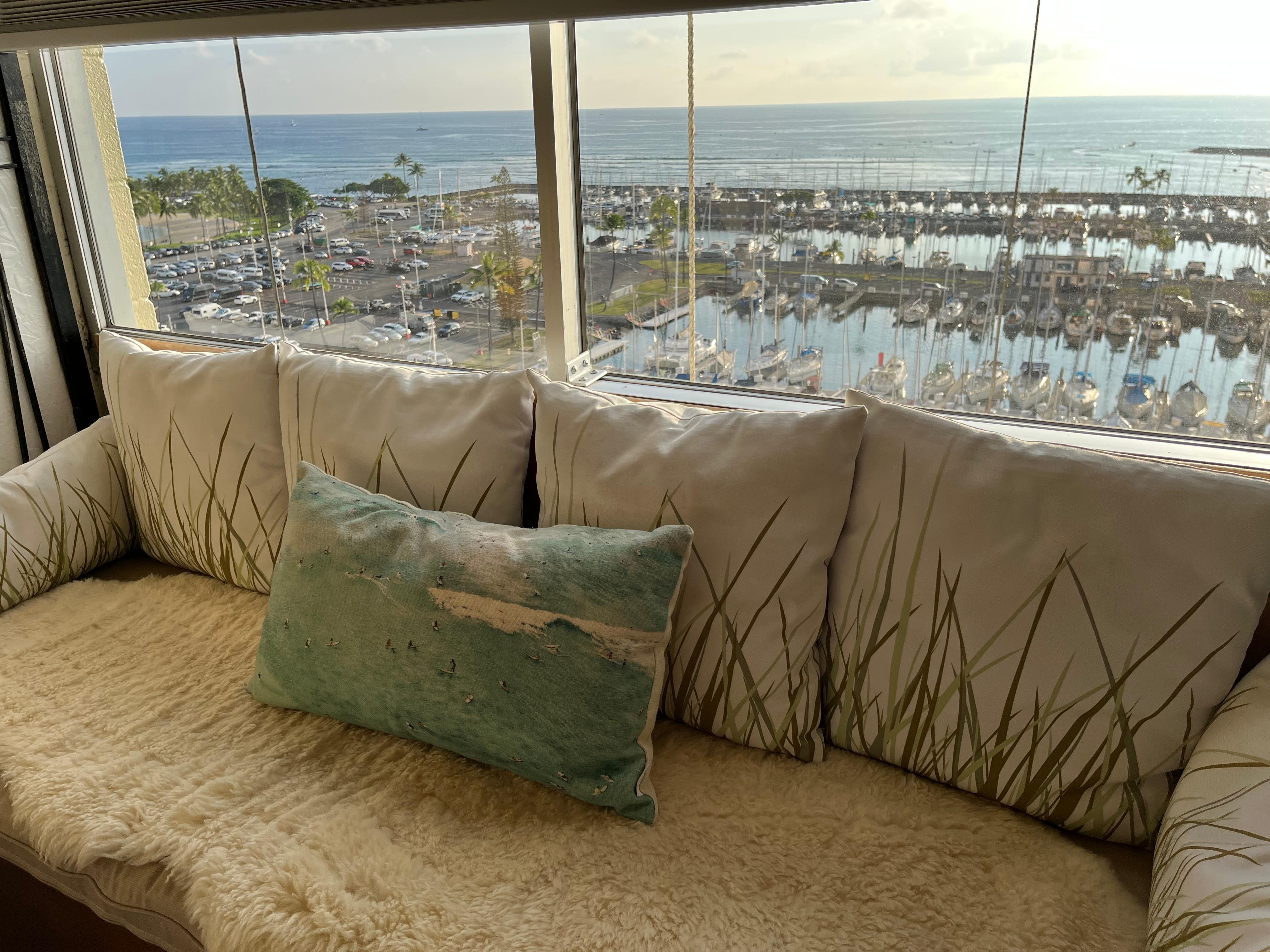 This is a rare unit where you can sit on the living room couch, watch TV and also watch the surfers at the famous Ala Moana surfing spots and boats going by.
