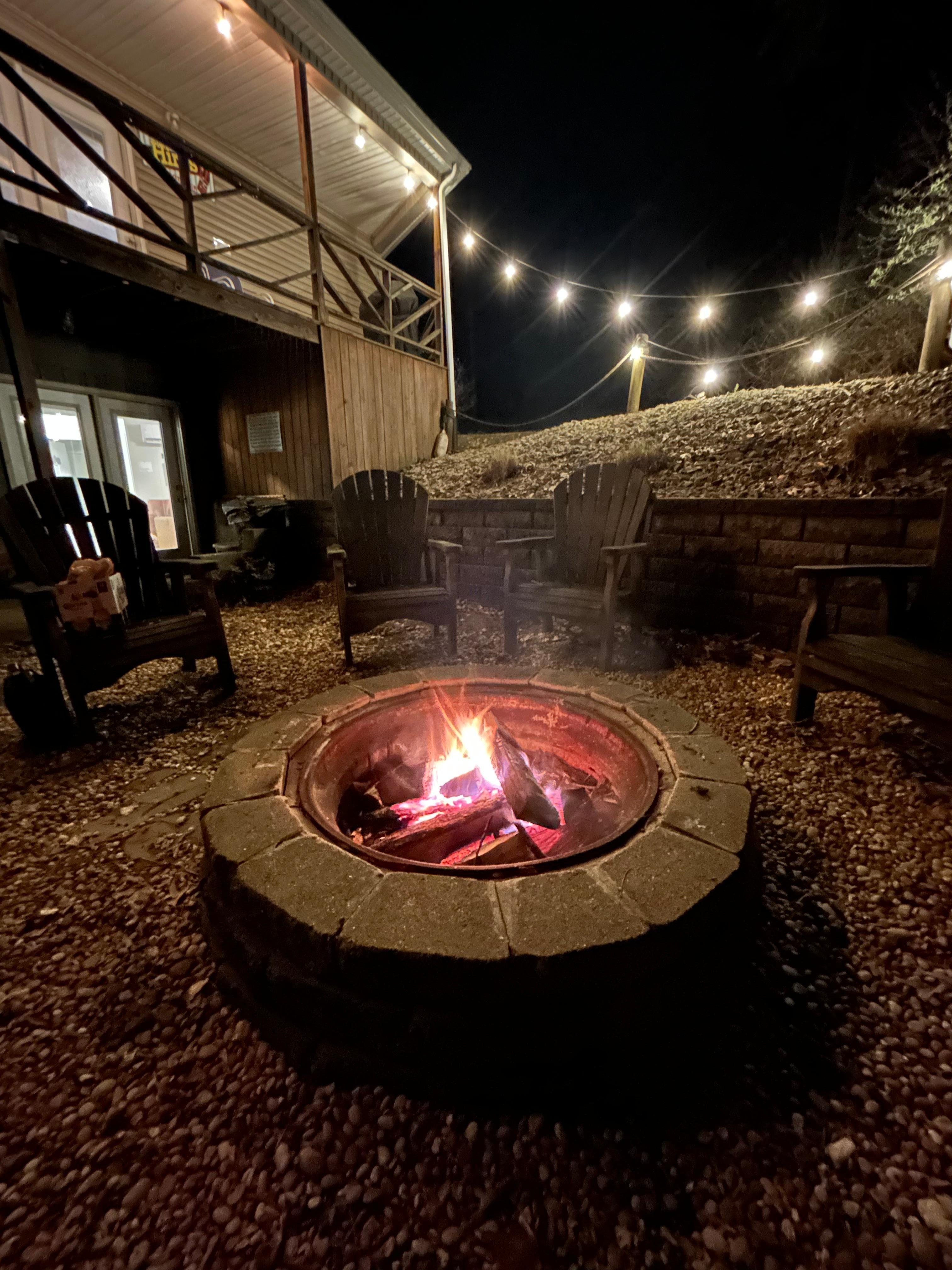 The LOWER-level doors open to a welcoming FIRE PIT with Adirondack chair seating where one can roast s'mores, share stories and play a game of corn toss.