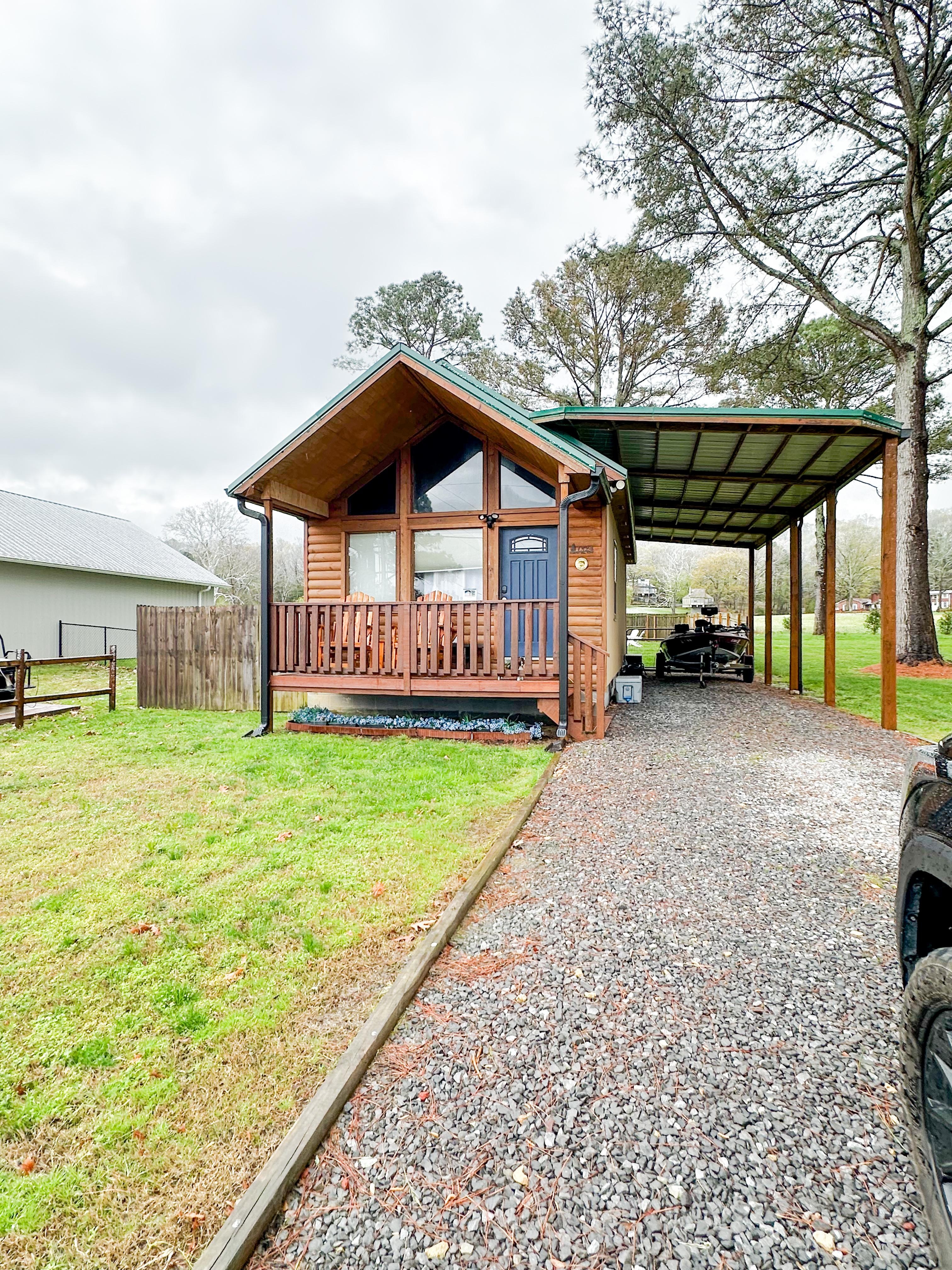 Experience a rustic cabin rental on a spacious, fully fenced pet-friendly property. Perfect for families and friends. The Lake Guntersville vacation rental features a kitchen, living room, open loft space, bedroom, and bathroom with outdoor recreation space.