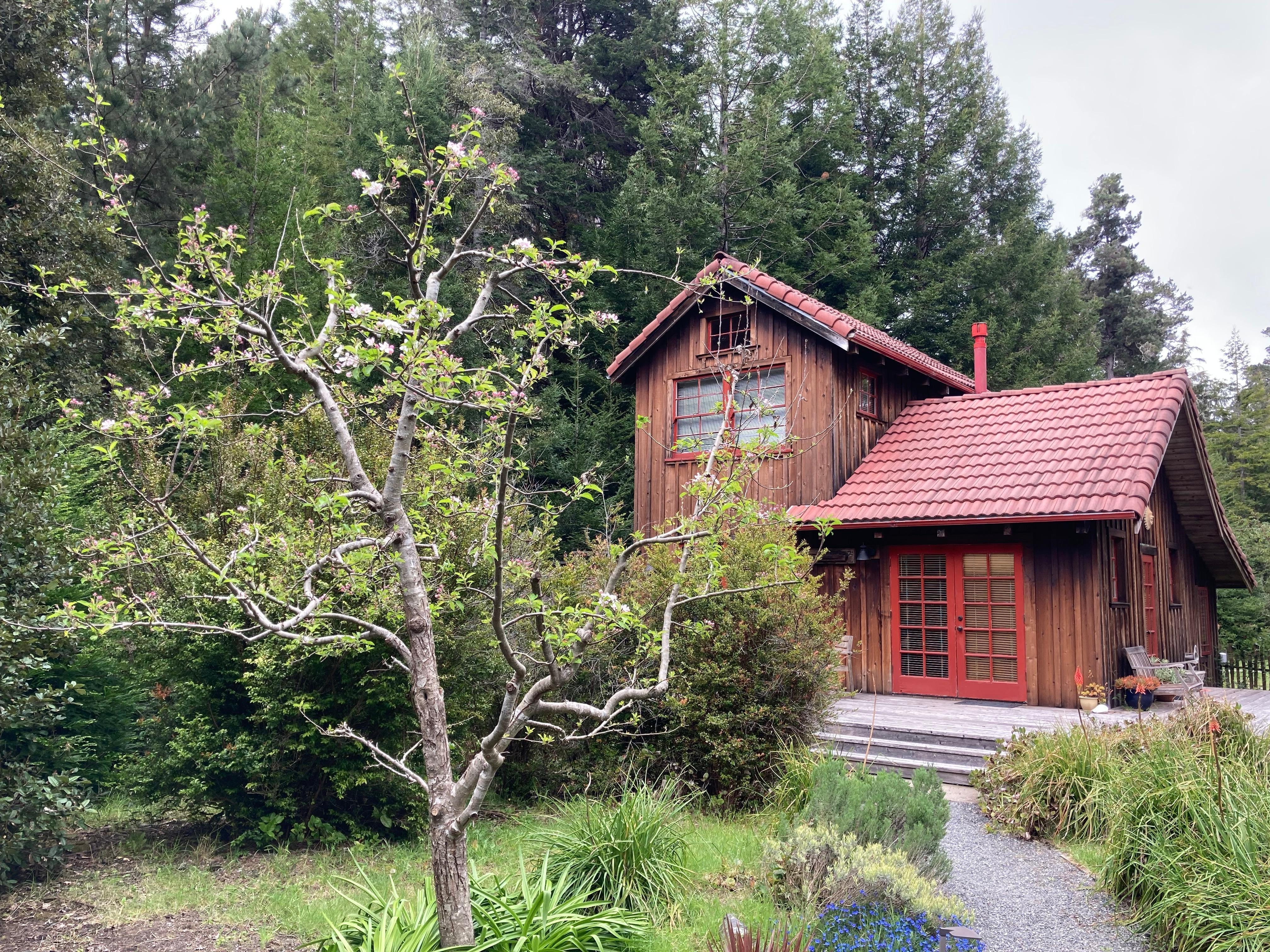 This 700 square foot cabin is located on 5 secluded acres and was designed and built entirely by the owners. The cabin includes many special touches such as open beamed ceilings milled with local redwood. The cabin has tons of natural light. A gas stove provides cozy heat and ambiance with the push of a button. There are also electric heaters in the bedroom and bathroom for additional warmth.