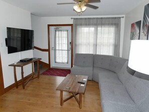 Former inn built in 1955 and converted into appartment around 2010. The condo is on 2 floors on the south side. The ground floor consists of a living room, a full kitchen, a dining room with a corner for teleworking and a bathroom. The 2nd floor consists of 2 bedrooms, a full bathroom (bath and separate shower) including washer-dryer and a work space equipped with a sit/stand desk. Each floor has an emergency exit.