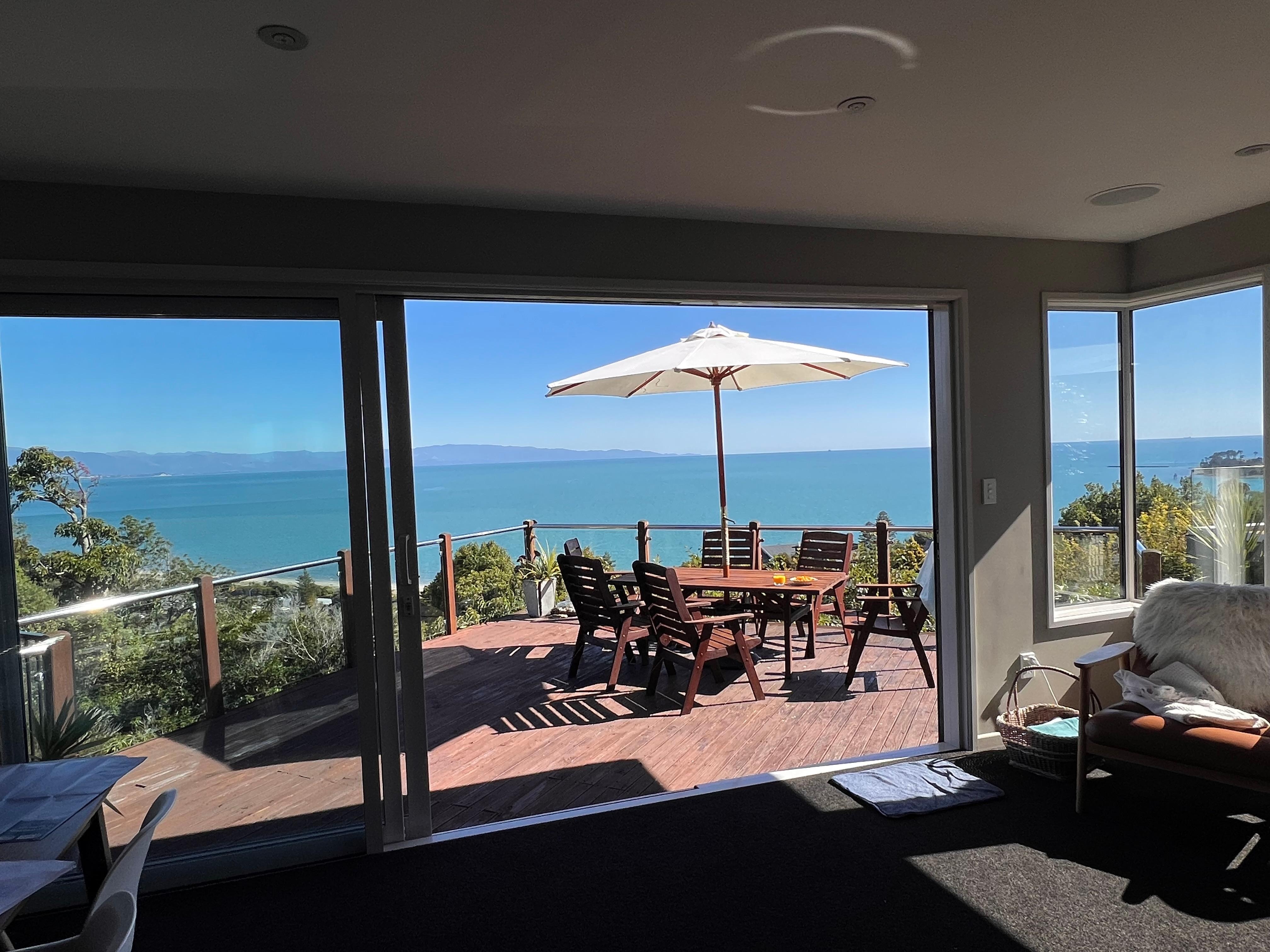 Exceptional Views over Tasman Bay Tahuna Beach! Lovely home and suitable for 3 couples , all with own amenities, plus one room downstairs. Plenty of seating. Exceptionally sunny in living areas and main bedroom. Wonderful to just sit on the decking and take in the views, and the activities on the water. Also close to walkway, down to the beach. Recommend.
