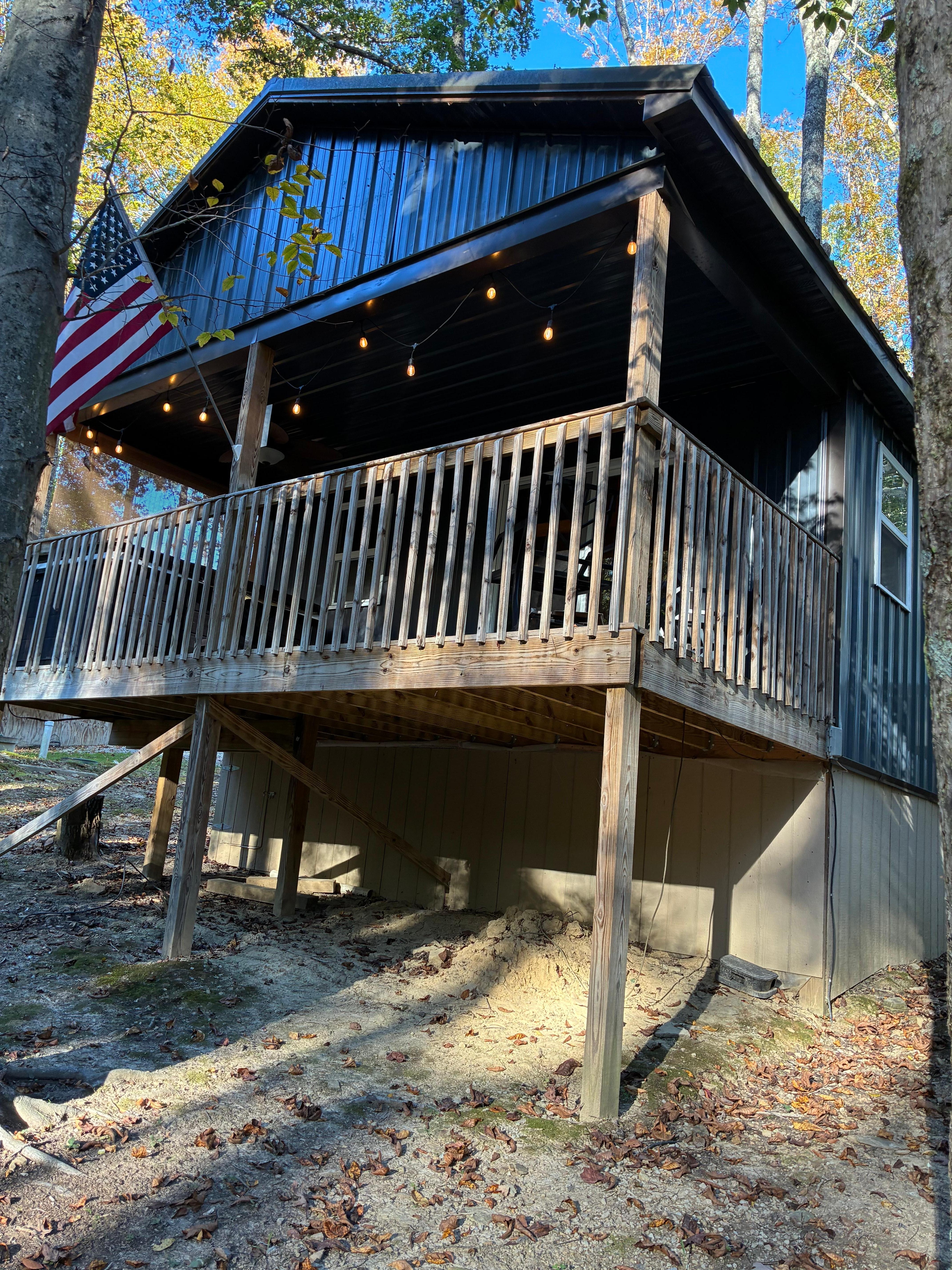 Clean well equipped cabin deck with outdoor lights made the evening for a competitive game of Sorry! Fire pit and charcoal grill made for easy dinner and s’mores.