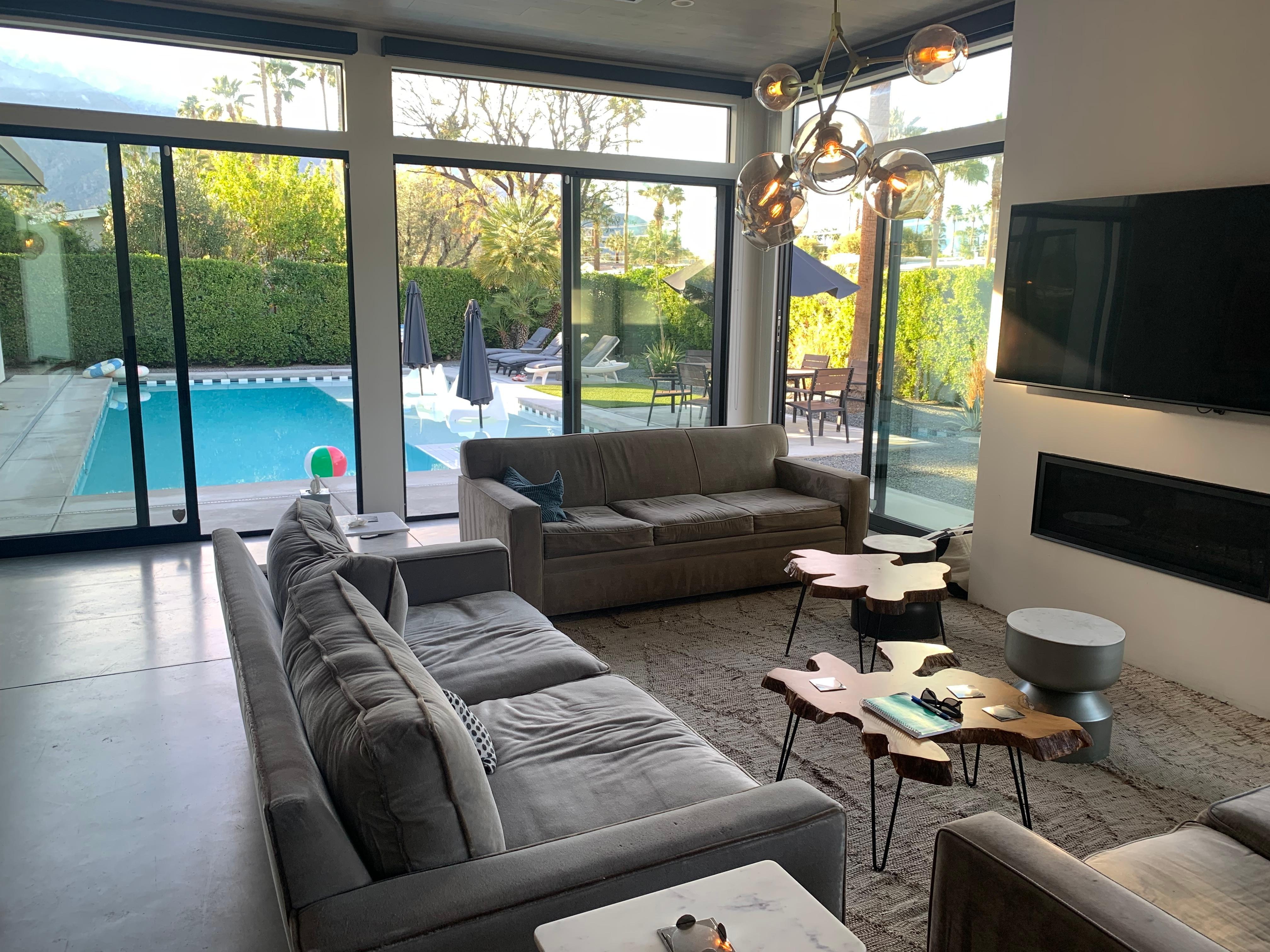 Palm Springs has unique city rules designed to keep neighborhoods peaceful, and we make them simple for you. 5 Palms Estate accommodates up to 12 adults plus 2 children under 12. Outdoor areas remain quiet after 10pm with no music outside at any time. The primary renter must be 25+ and present, with up to 6 vehicles permitted. Pets are considered on request with a fee. Weddings, events, and commercial use are not permitted. For peace of mind, all Palms at Park properties feature exterior Nest cameras and outdoor noise monitors. Longer stays of 28 nights or more require a deposit and exclude utilities. A signed rental agreement, ID, and guest list are required within 24 hours of booking, a quick and easy process.