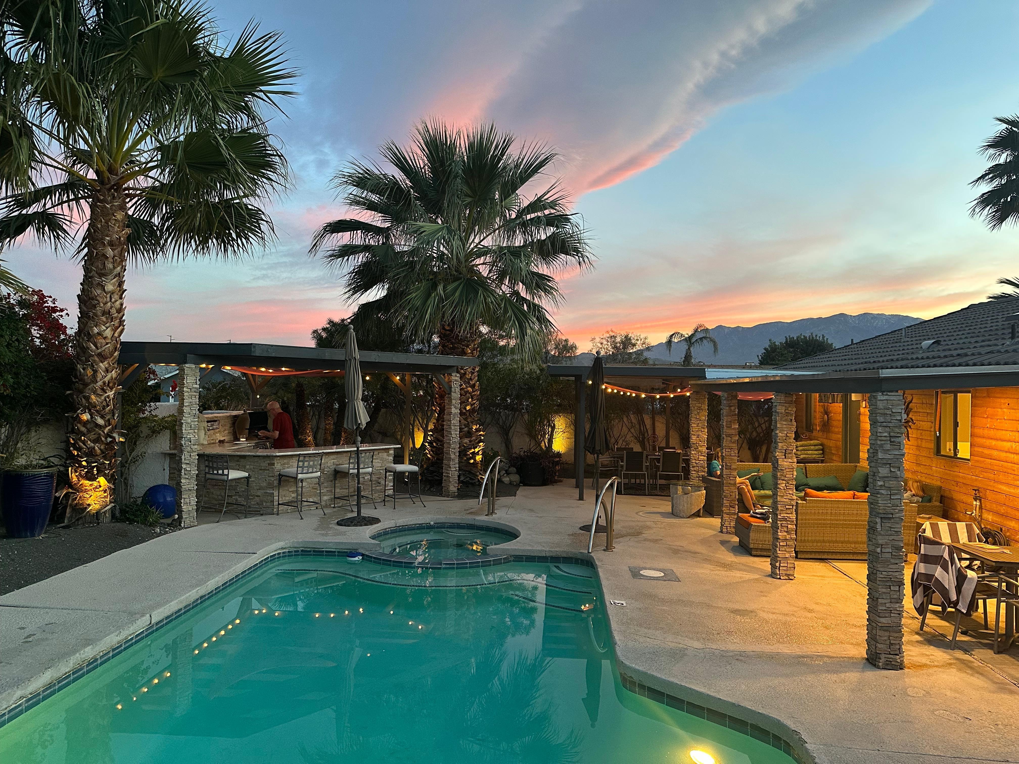 The backyard is fully decked with tons of entertaining space and plenty of covered seating, too. Outdoor dining is covered so you can maximize outdoor living both day and night. There are 4 chaise lounges to catch the rays you were seeking in Palm Springs. The outdoor kitchen will make grilling fun and the counter at the grill with bar-stool seating ensures you can bring cocktails and snacks to keep the grill master entertained. There's a half-bath/powder room on the patio for everyone's convenience.