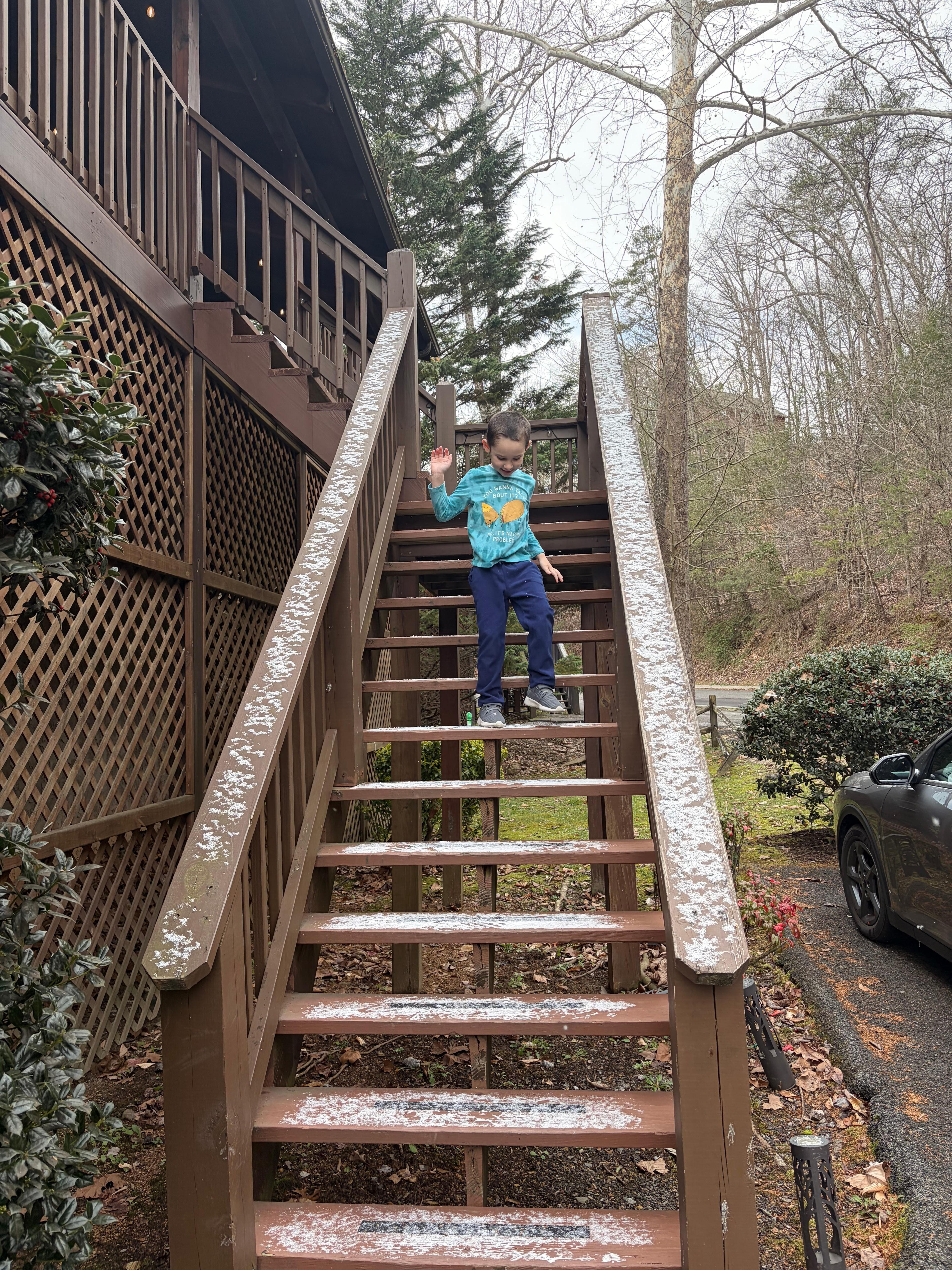 We had a great time at the cabin. It was clean stocked well and actually had a good supply of pots and pans and dishes for those who want to cook I am not sure, but it should list that there are two flights of steps to the entrance of the home. My mother is on a cane, but she made it fine. Just have to be careful for the little ones also. Proximity to everything in pigeon Forge and Gatlinburg is great and I walked several miles two of the mornings and felt safe and enjoyed the scenery immensely