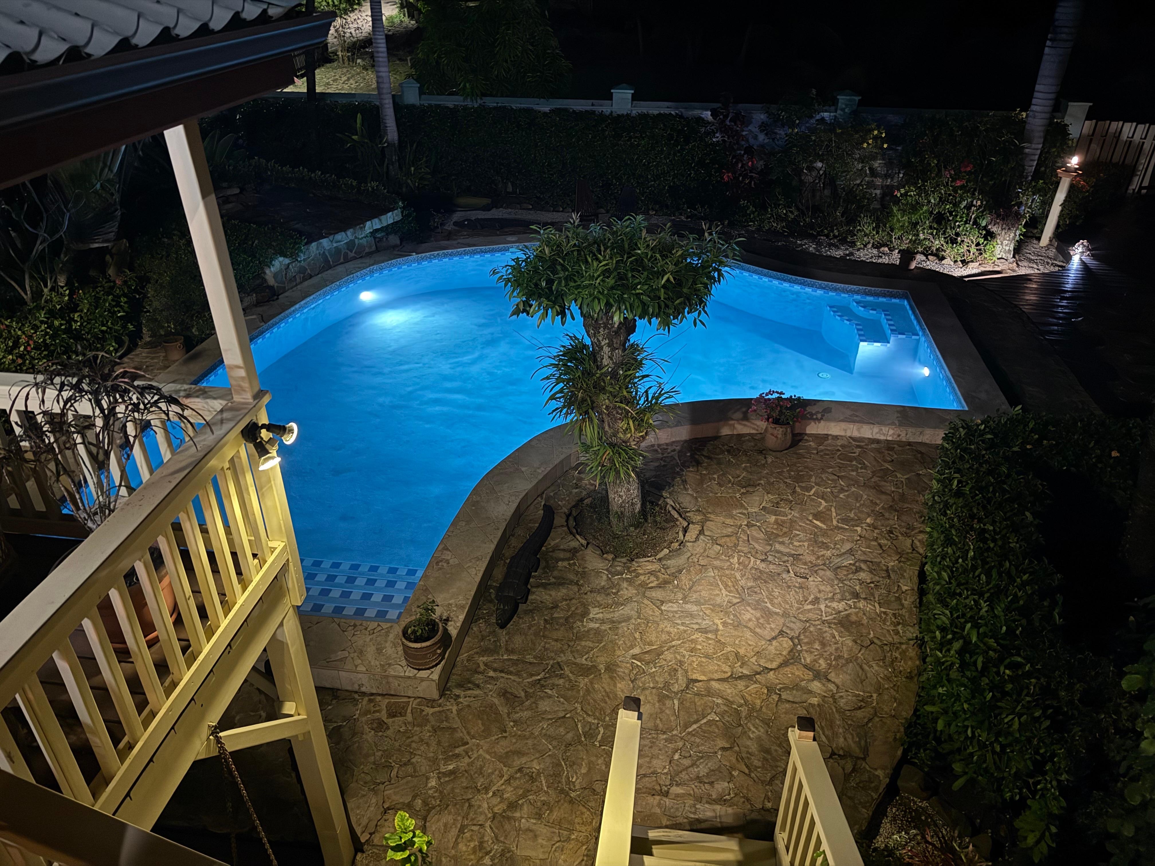 Near the pool area is also a new entertainment area complete with an outdoor kitchen. Beautiful custom made picnic table and wet bar complete with refrigerator and Caribbean style gas/wood/briquet BBQ with a smoker to prepare and enjoy those more casual meals and drinks.