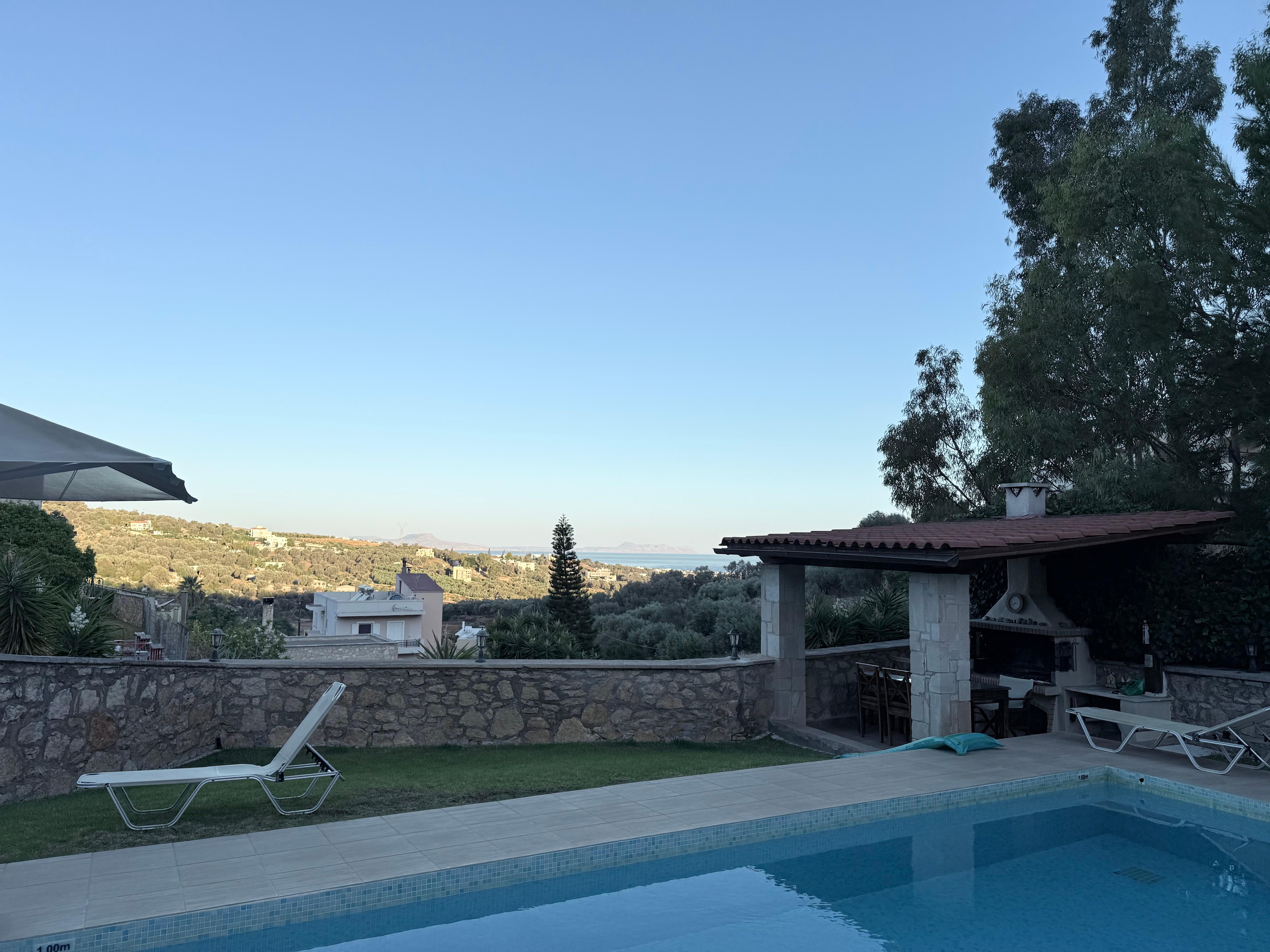 beautiful sunny balcony with views over the pool and sea beyond.