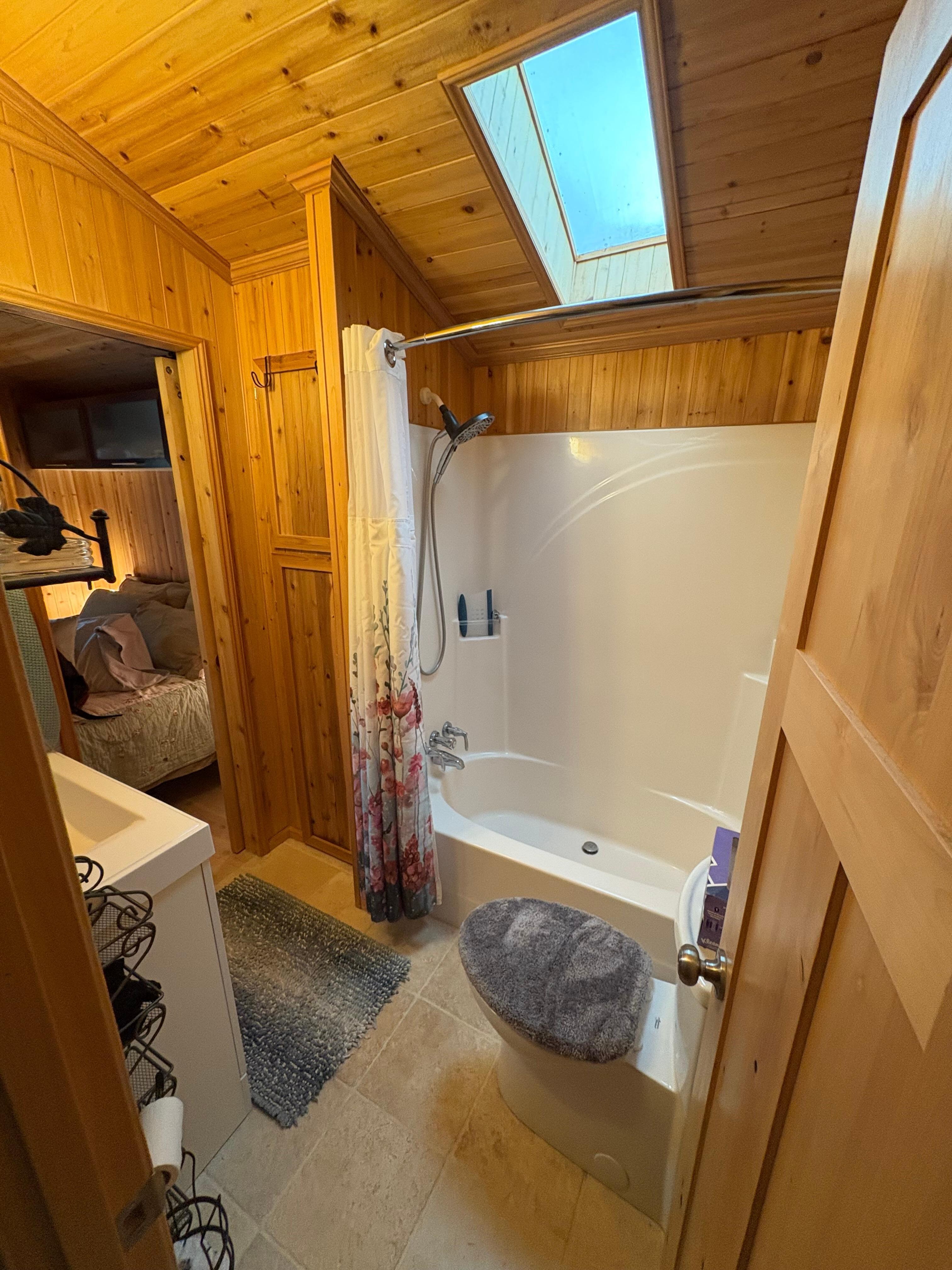 The bedroom includes a queen size bed and an ensuite bathroom with a single vanity and a shower/tub combo.