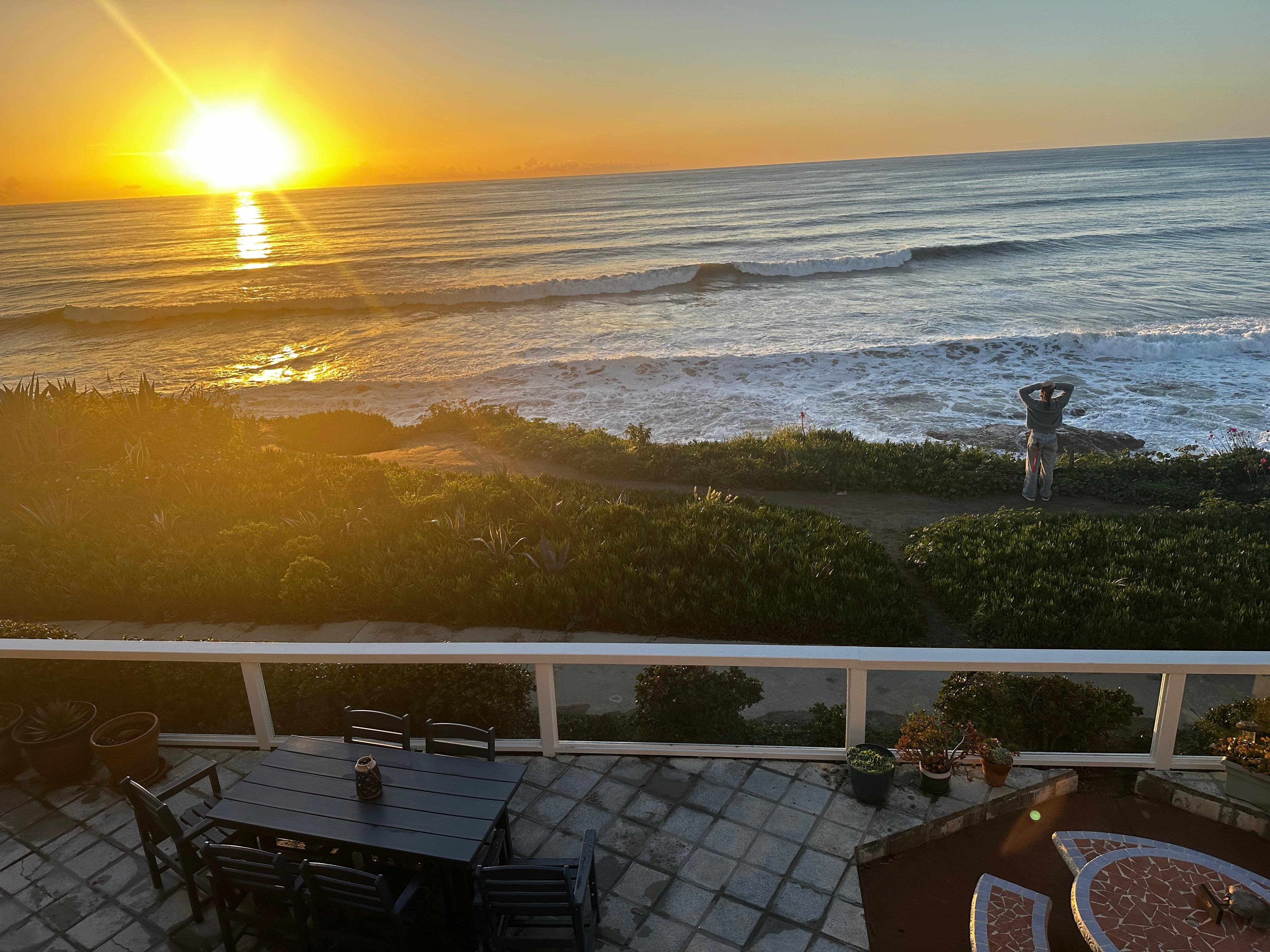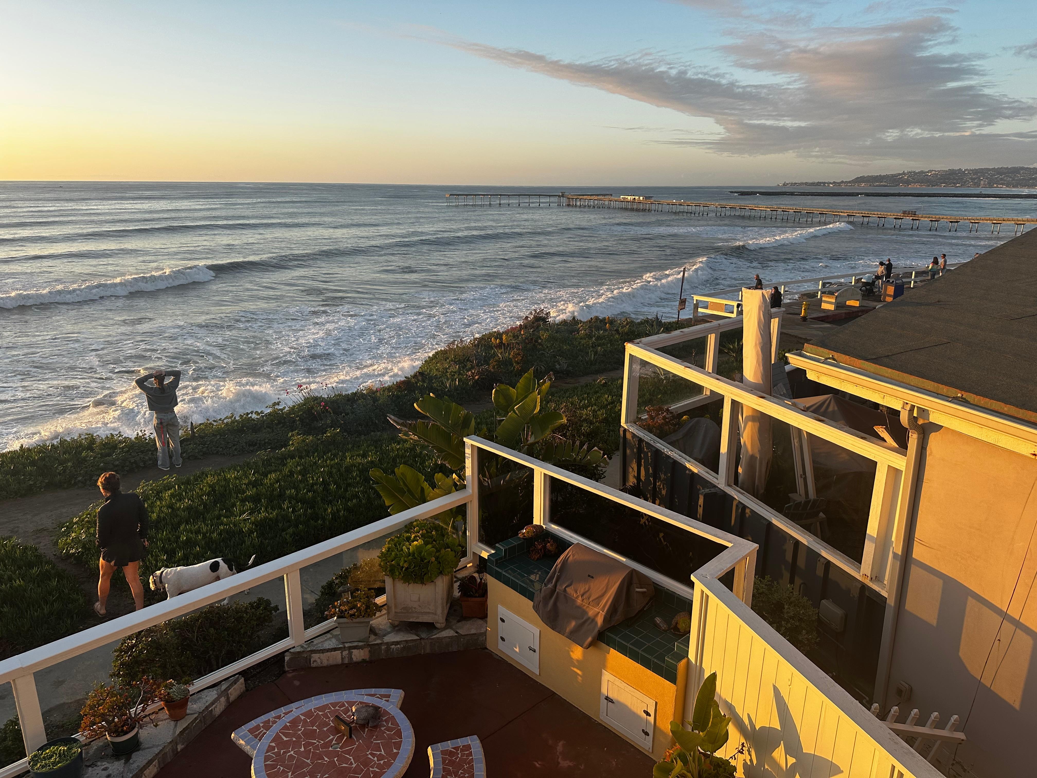 It is just a short walk down sturdy steps to explore the tide pools below or to go to a pristine white sand beach in a secluded cove. If you prefer to play in the surf at a large public beach with lifeguards, it's only a seven-minute walk. Fishing on the Ocean Beach Pier and surfers add interest to your view (and your photos)! At night, the lights of La Jolla sparkle in the distance.
