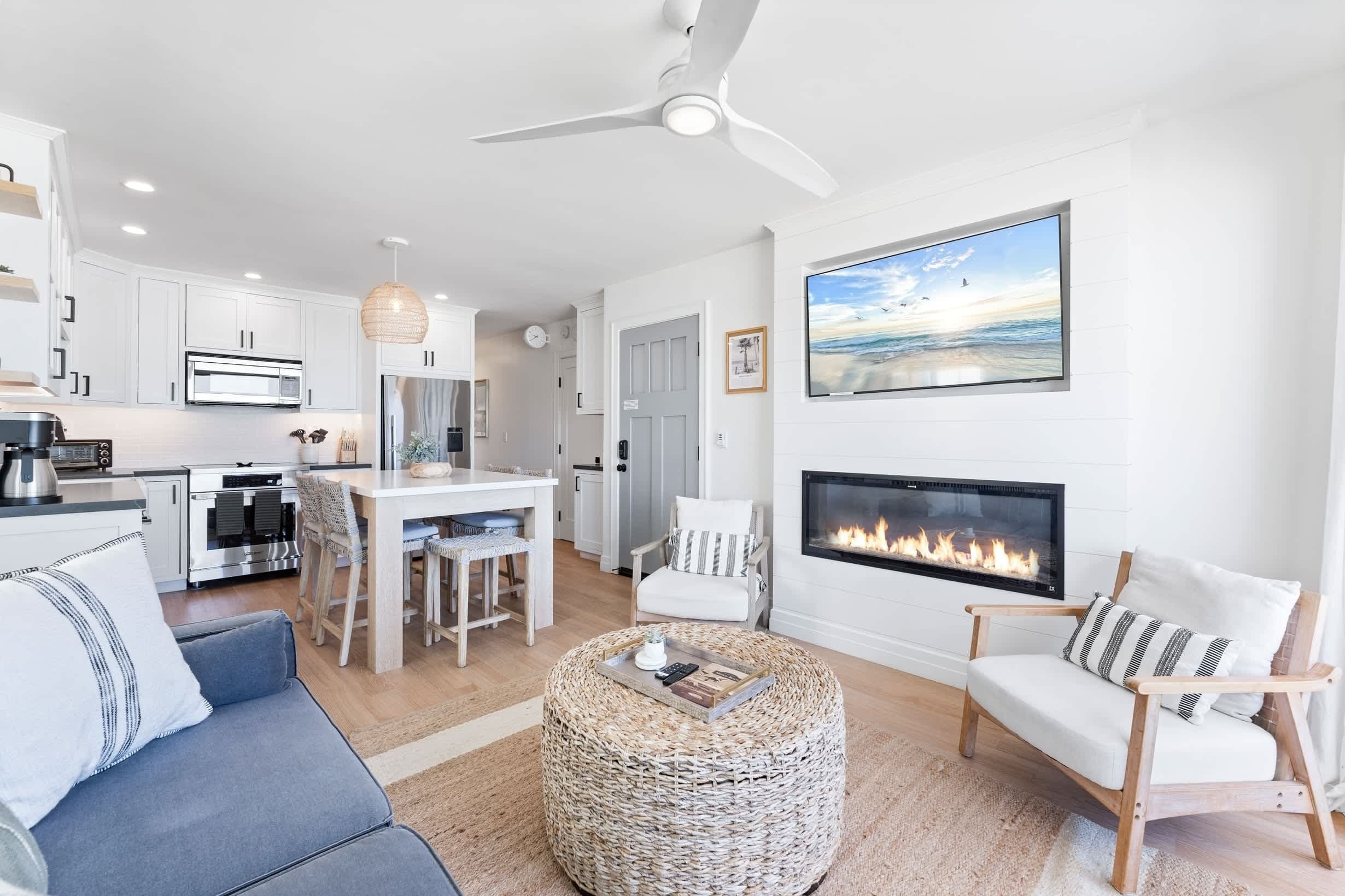 Make yourself at home in this newly remodeled ocean-view living area, featuring plush seating and a 60in smart TV.