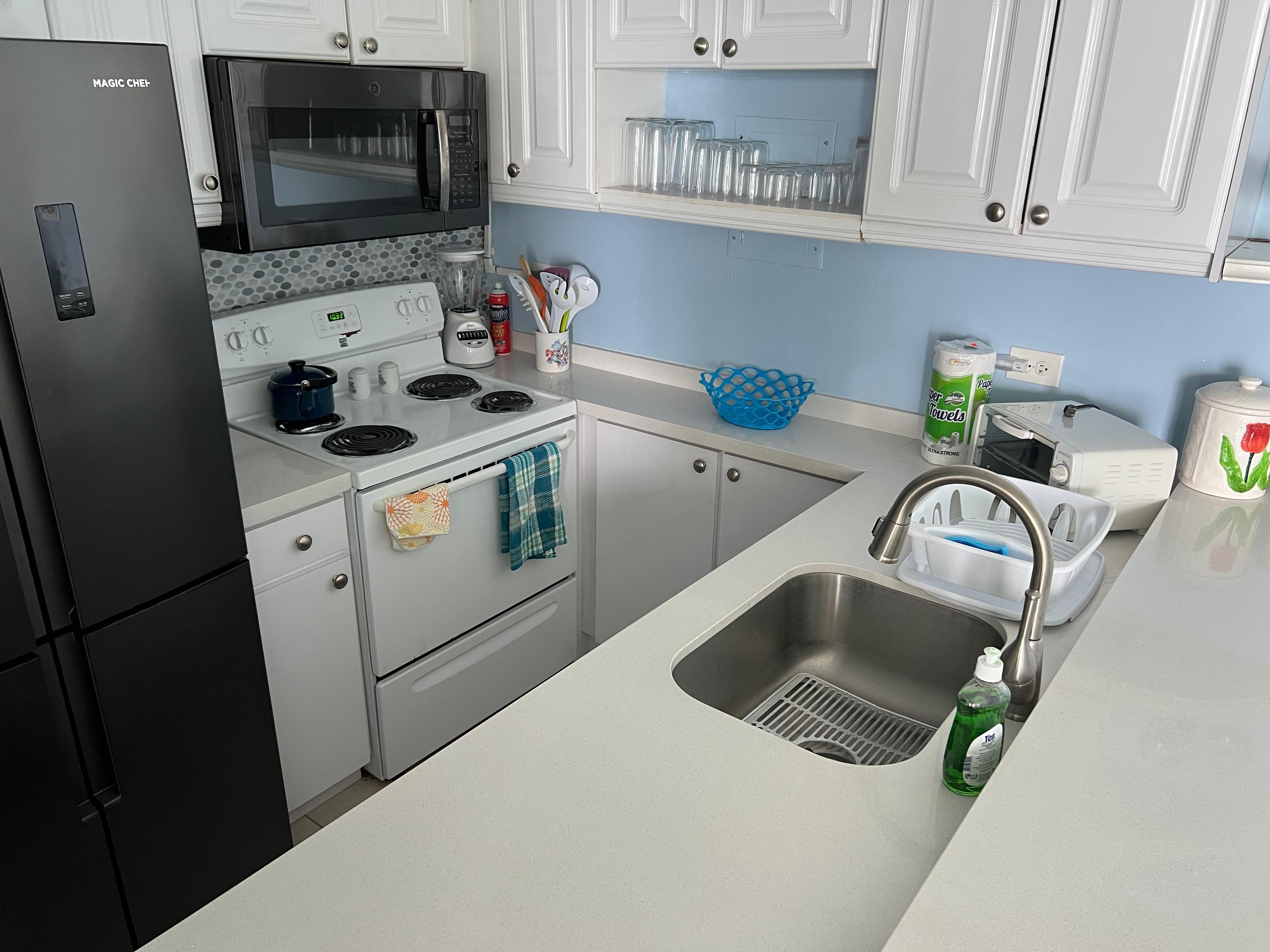 When you enter this recently renovated, fully furnished, 15th floor 1-bedroom apartment in Marbella Oeste, you are WOWED by the stunning 180° view from the balcony of beautiful Isla Verde Beach, the best beach in all of San Juan. The open kitchen design affords a communal ambiance while encompassing lots of work and cabinet space for those wishing to cook. There are plenty of dishes, utensils, pots, pans, small electrics (microwave, toaster oven, coffee maker, blender, etc.), a dishwasher, as well as a full-sized stove and refrigerator. The bedroom is furnished with a king sized bed. The bathroom has a tub with shower, towels and a hair dryer. The washer/dryer in the hall along with laundry detergent provides easy maintenance of beach and bath towels. The flat screen TV in the living room is connected to a DVR/cable box and Firestick. High speed wireless enables the use of tablets, laptops and cellphones for work or play. A notebook with the condominium rules, information about the apartment and area, and instructions for operating the dishwasher and A/C is provided. Renters are welcome to add comments.