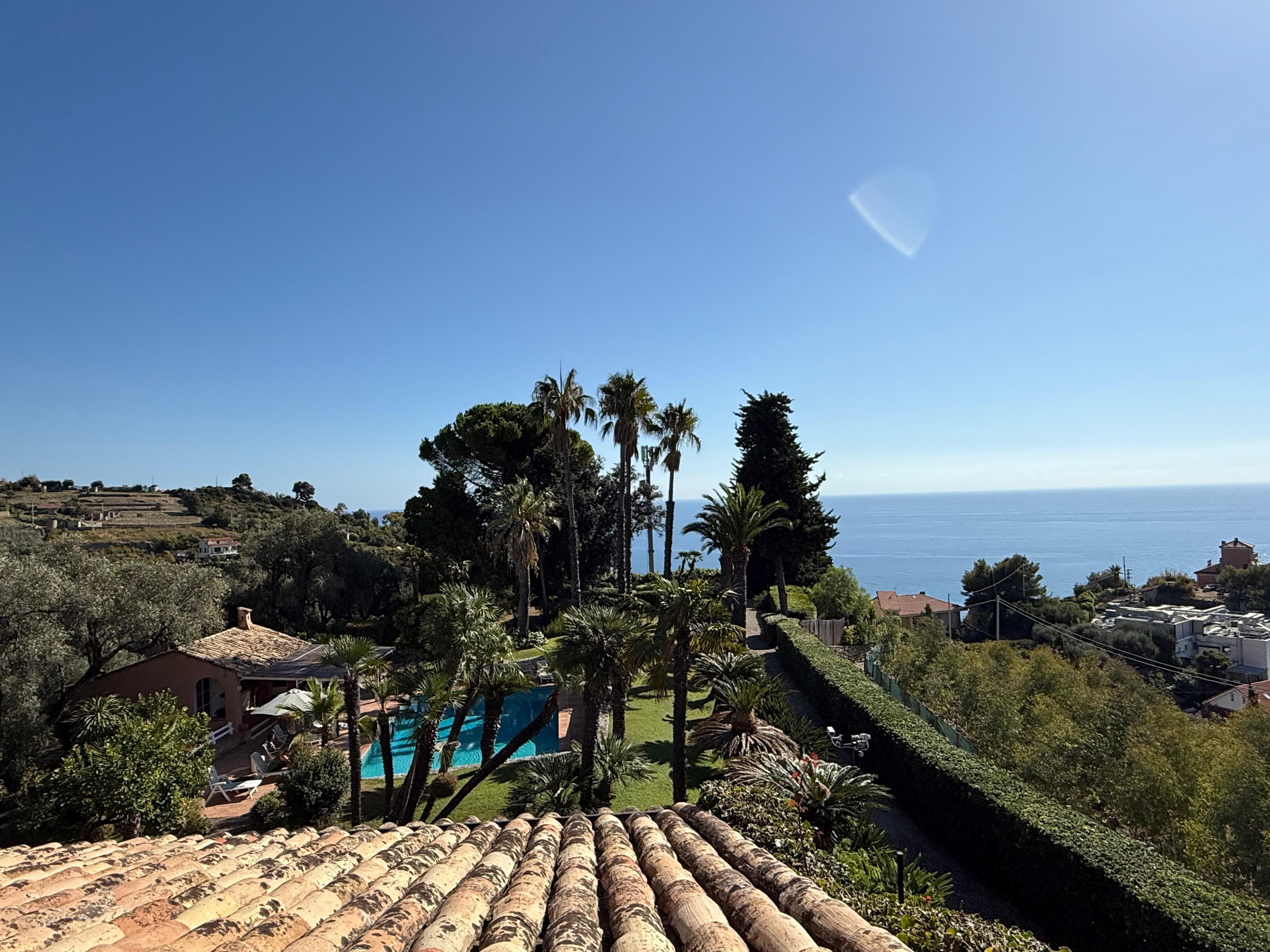 In the Riviera dei Fiori, in Liguria, in a panoramic area near Sanremo, this elegant 700 sqm villa is located, surrounded by a charming 5,500 sqm botanical park, fully enclosed and with a sea view. Once owned by the Lancaster family, it retains a timeless elegance with historical elements such as the original floor from a French abbey and 18th-century boiseries that adorn the large billiard room and study, as well as an ancient 15th-century fountain displayed in a niche of the dining room. The villa offers a spacious fitness room equipped with a sauna and Turkish bath, as well as a mosaic pool surrounded by tall palm trees. In the solarium, there is a large pergola hosting a table for poolside banquets, near the masonry barbecue and the bar counter, perfect for preparing cocktails. Note: Near the entrance gate to the property, distinctly separate from the villa, is the caretaker's residence, who, with utmost discretion and without interfering with guests' privacy, takes care of the park maintenance and pool cleaning.