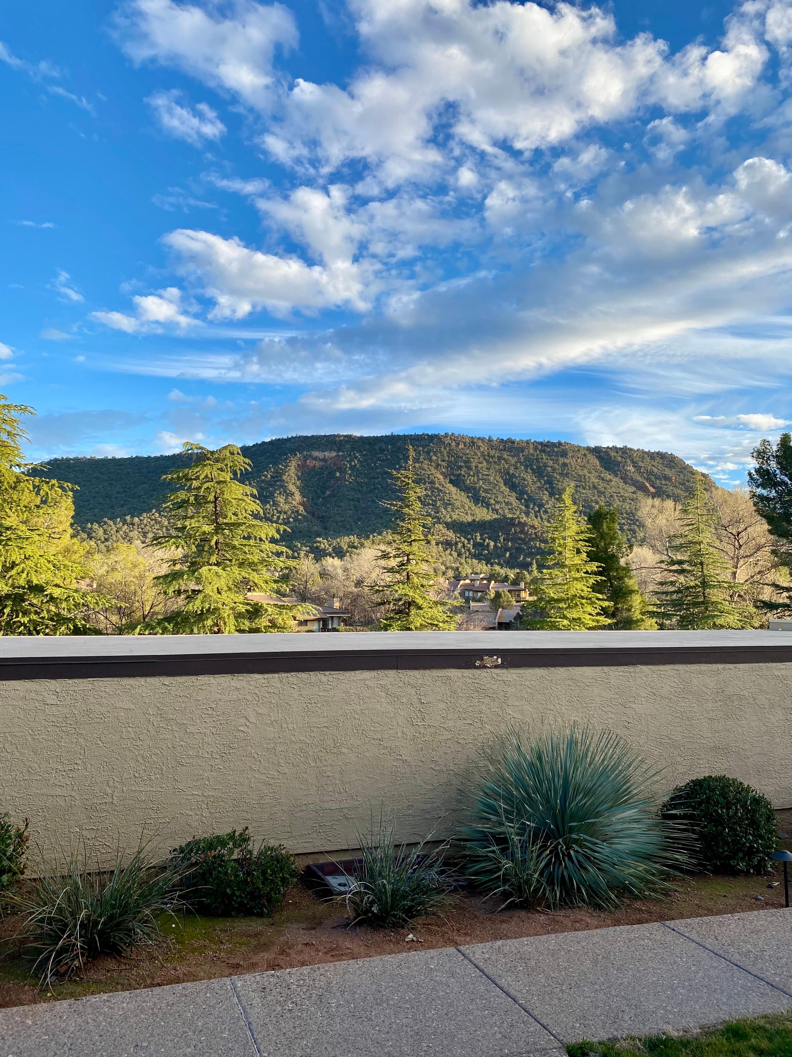 Front patio enjoys early morning sun with views of Wildhorse Butte.