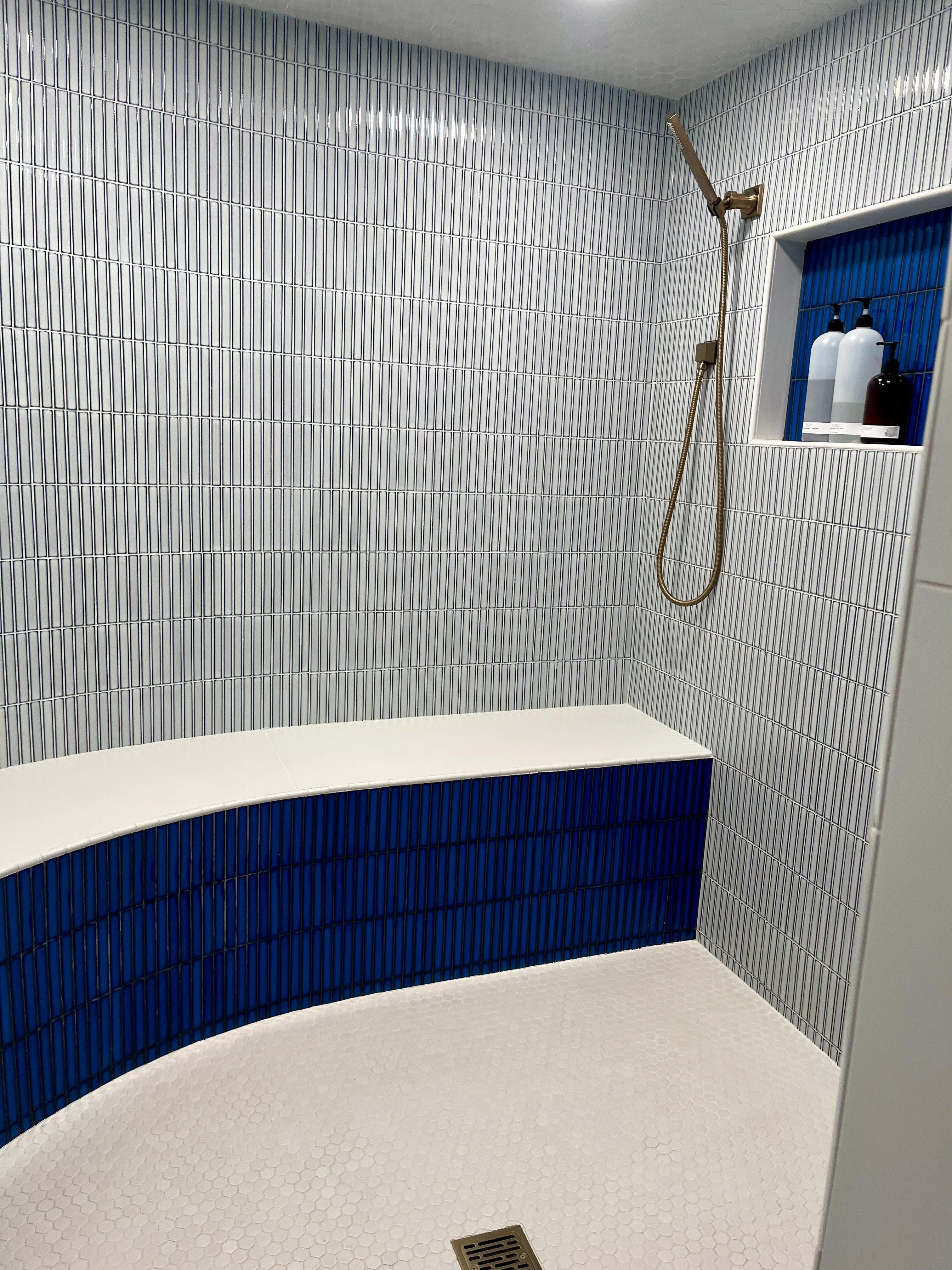 - Custom walk-in shower with wrap-around bench, rain shower, hand shower, body jets