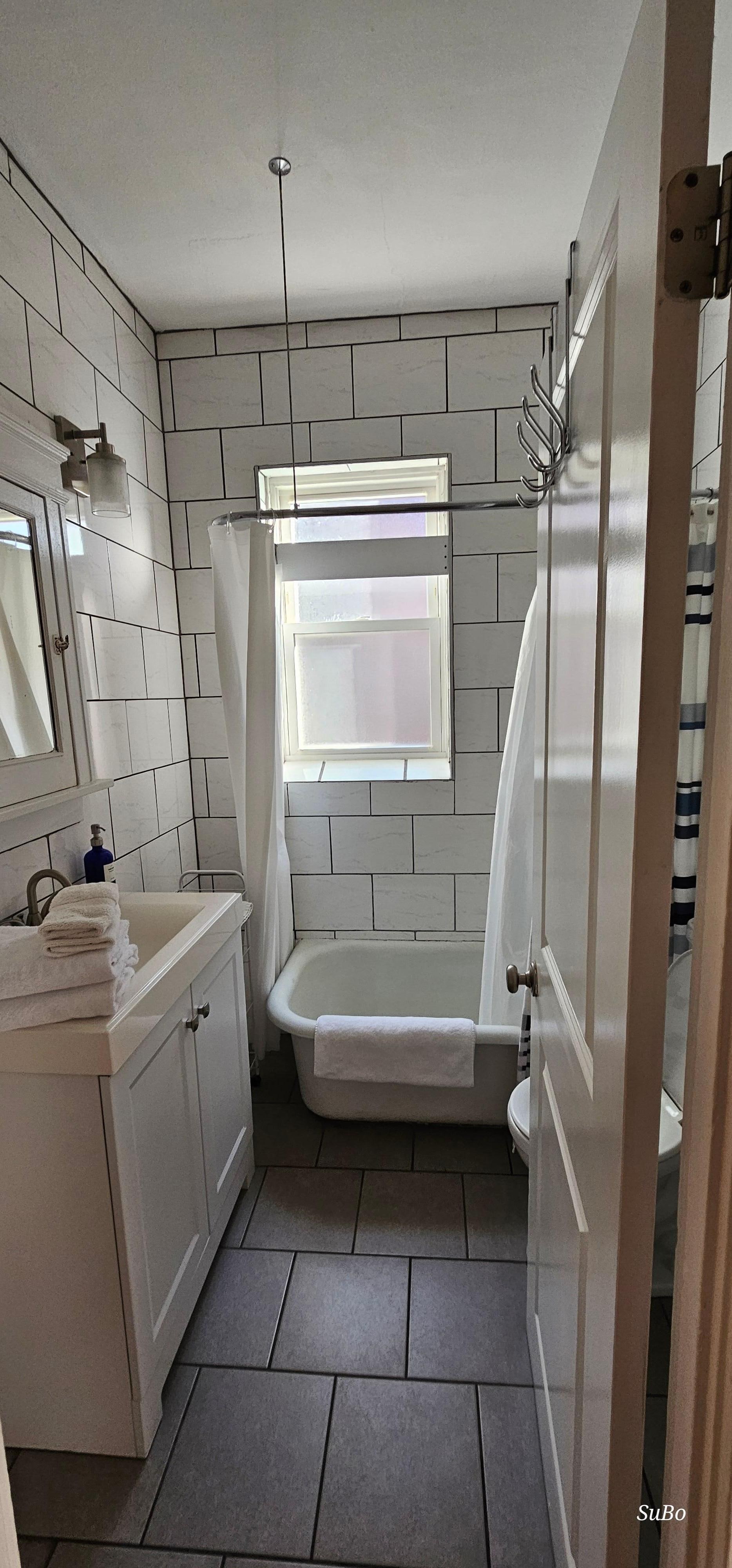 The newly remodeled bathroom features tiled walls with premium stainless fixtures and granite countertops. The bathroom is stocked with complimentary, high-quality, all-natural artisan shampoo, conditioner, and body wash from Beekman 1802. The bathrooms are stocked with fresh towels for your stay.