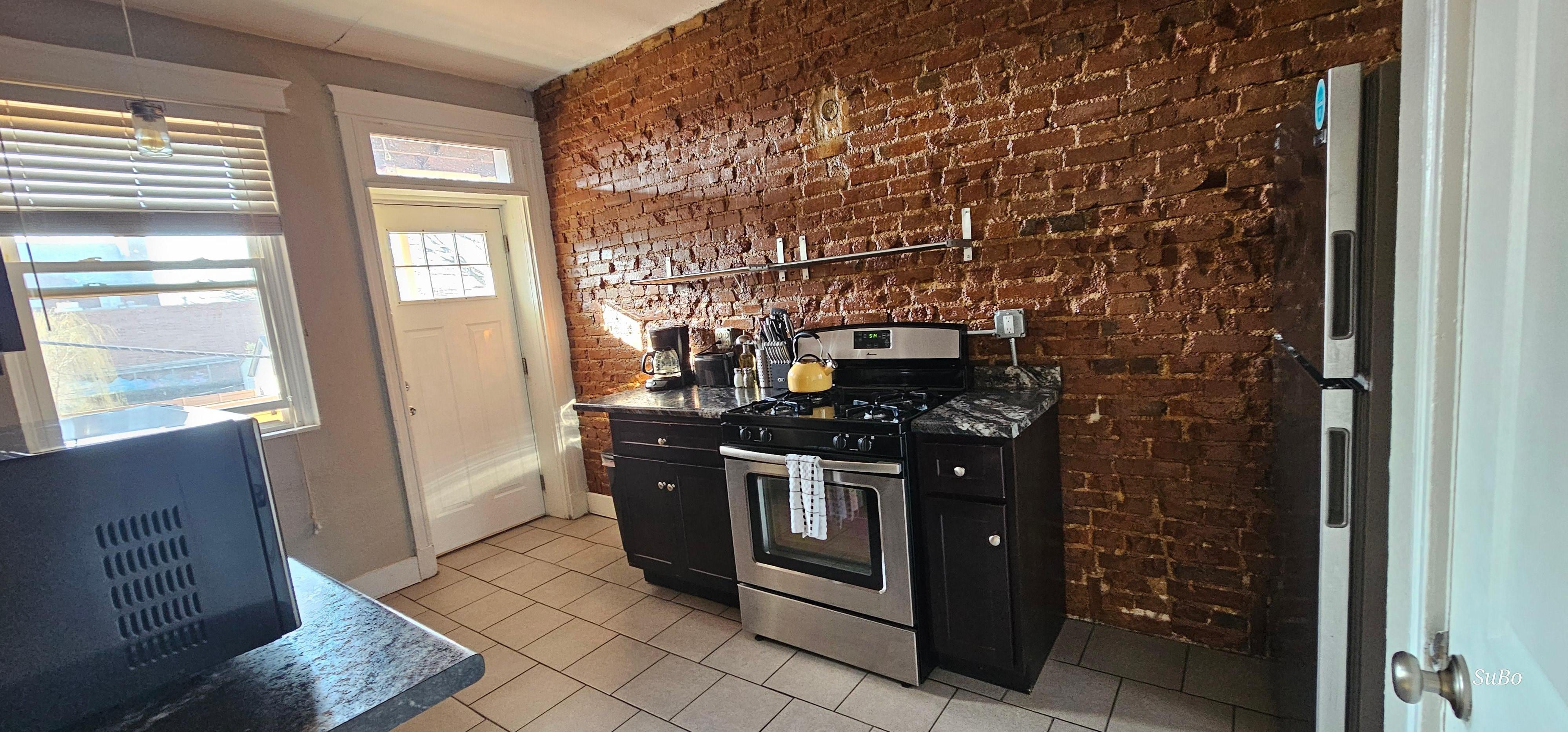 The full kitchen features a stainless steel refrigerator, stove, oven, dishwasher, and microwave, and Edison lighting over exposed brick walls. The kitchen comes chef-ready, with pots and pans, dishes, glasses, utensils, and basic condiments like salt, pepper, and oil provided free of charge. We also provide our guests with an assortment of complimentary teas, coffee, and purified Brita water.