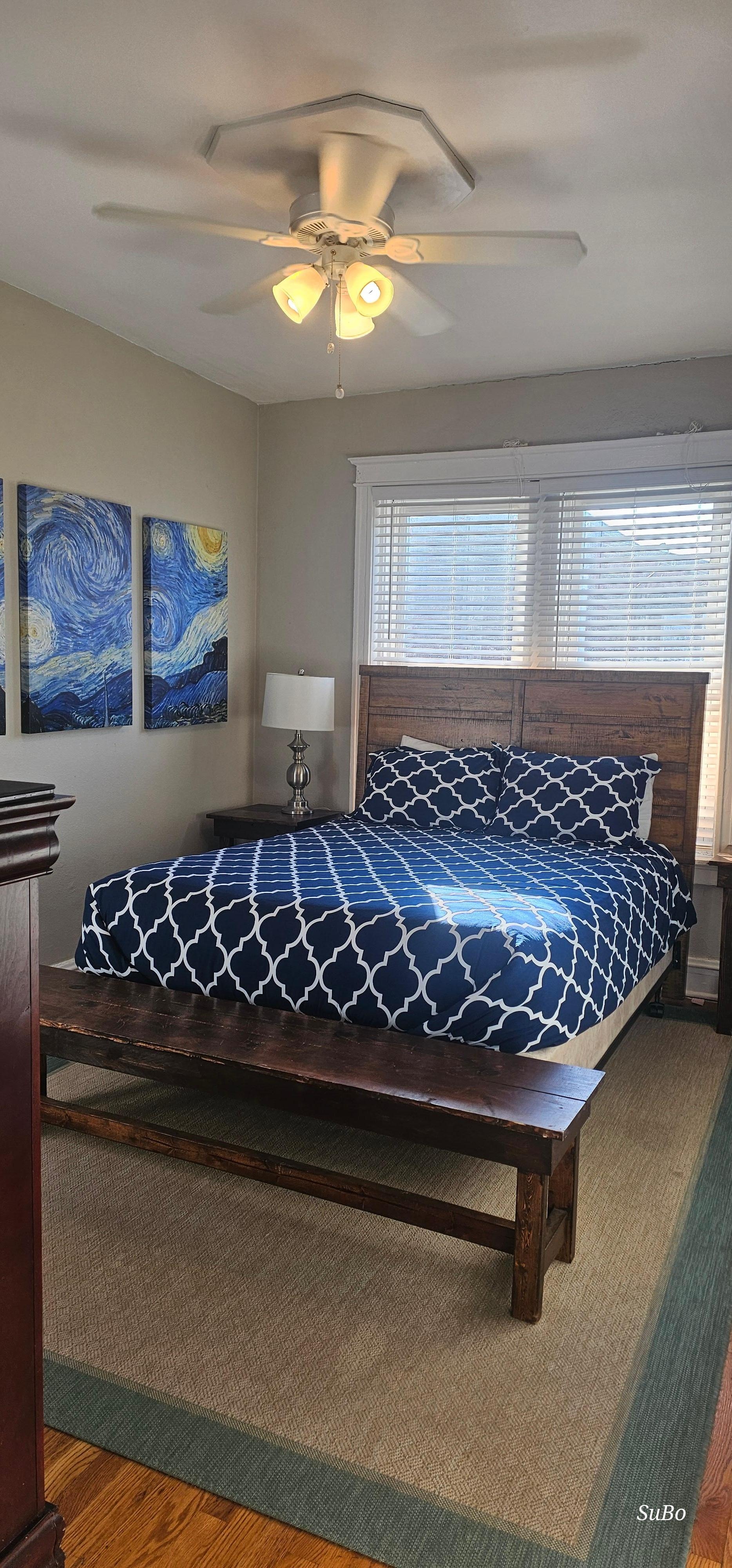 The cozy bedroom overlooks the fenced backyard and features hardwood floors, a comfortable high-end queen bed with high-quality, 100% cotton sheets, a dresser, a full-length mirror, a closet. and locally made, hand-crafted bench and nightstands. The bedroom features a gorgeous 3-panel painting of Van Gogh's "Starry Night" and Van Gogh's "Starry Night over the Rhone" on the adjacent wall.