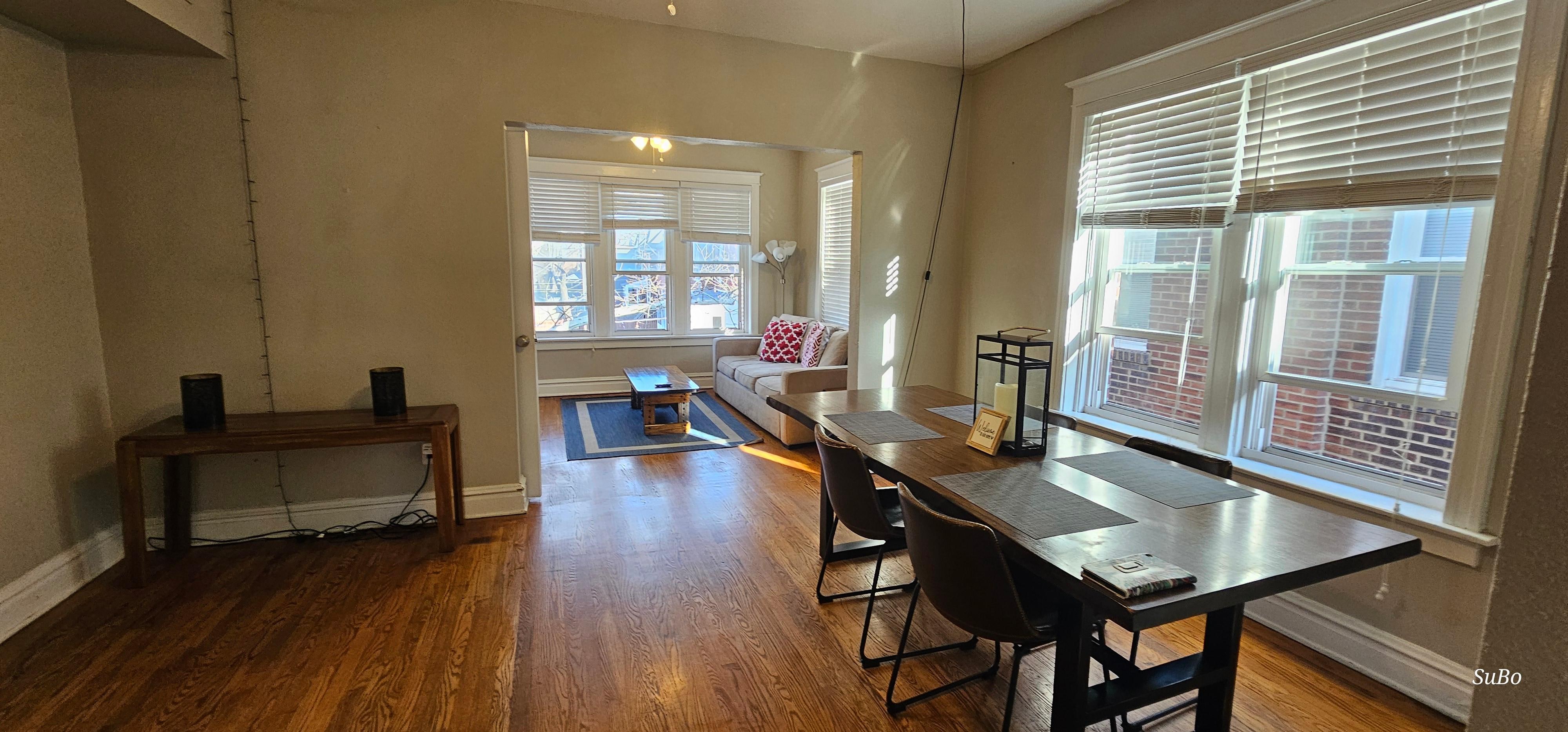 The living room features wall-to-wall hardwood floors, bright windows, a large closet, and a stylish sofa. Should you require an additional bed, the sofa swiftly and easily converts to a queen bed, and we provide the linens. The artwork is Vincent Van Gogh's "Road with Cypress and Star". The living room is also equipped with a 40" flat screen, 4K Smart TV with complimentary Netflix.