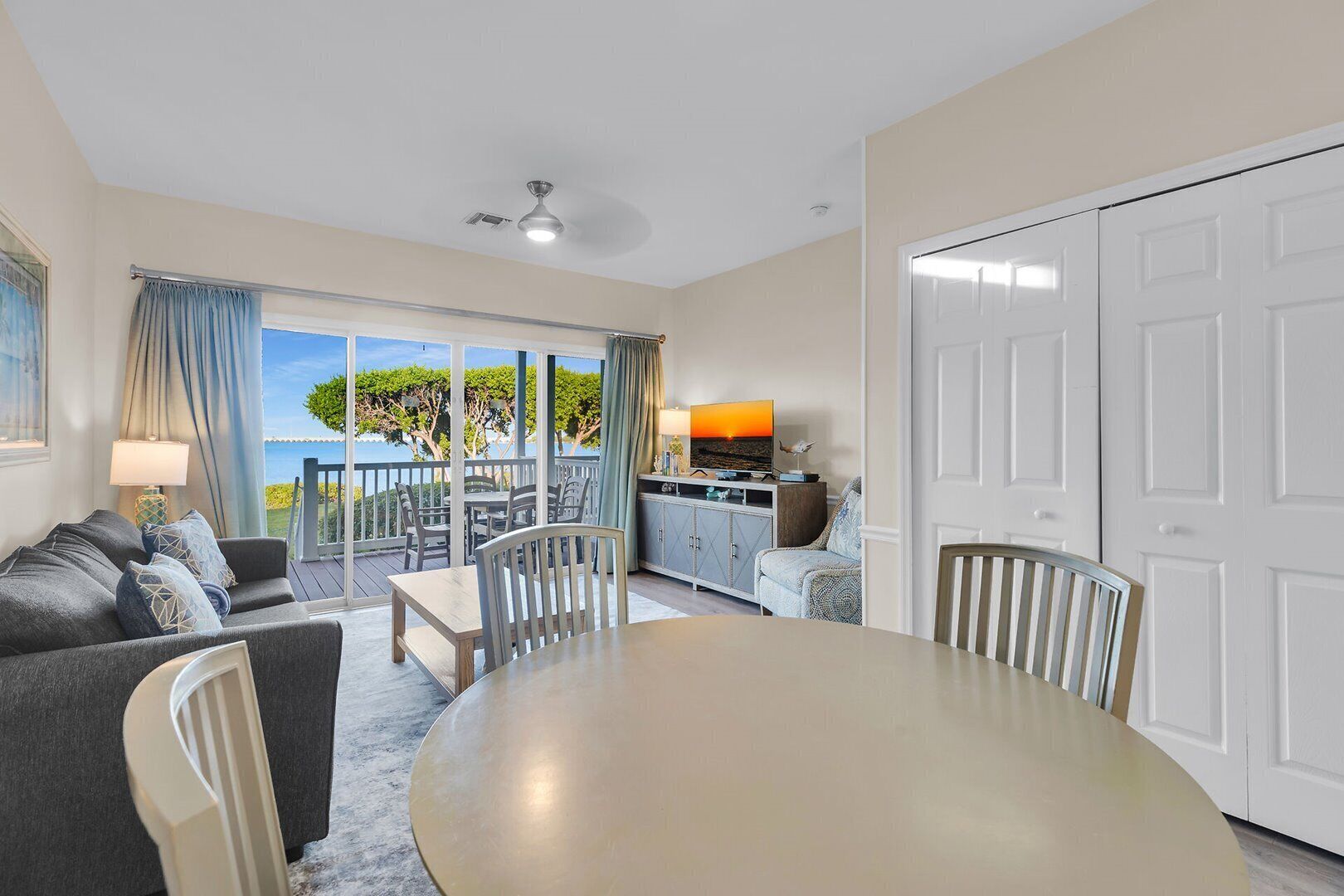 We appreciated the professional and responsive management. They made the check-in process very smooth and they helped us with missing items in the kitchen. This condo had a pending sale when we stayed there, so maybe the new owners will clean it up more. Mainly it had worn and stained furniture, broken sliding mechanism on sliding door, and other odd things in the kitchen (salt and pepper shakers with nothing in them, disposal with something already in it when we arrived, and the dishwasher is not even attached to the island...so it moves). Overall though, we worked around the glitches and enjoyed the beautiful view, the pool and bar, the little beach, and the nice pier. It's also a nice neighborhood to walk around and we walked all the way to the state park nearby. We would stay in this complex again for sure, but we would request a different condo. Thanks for the friendly, professional management!