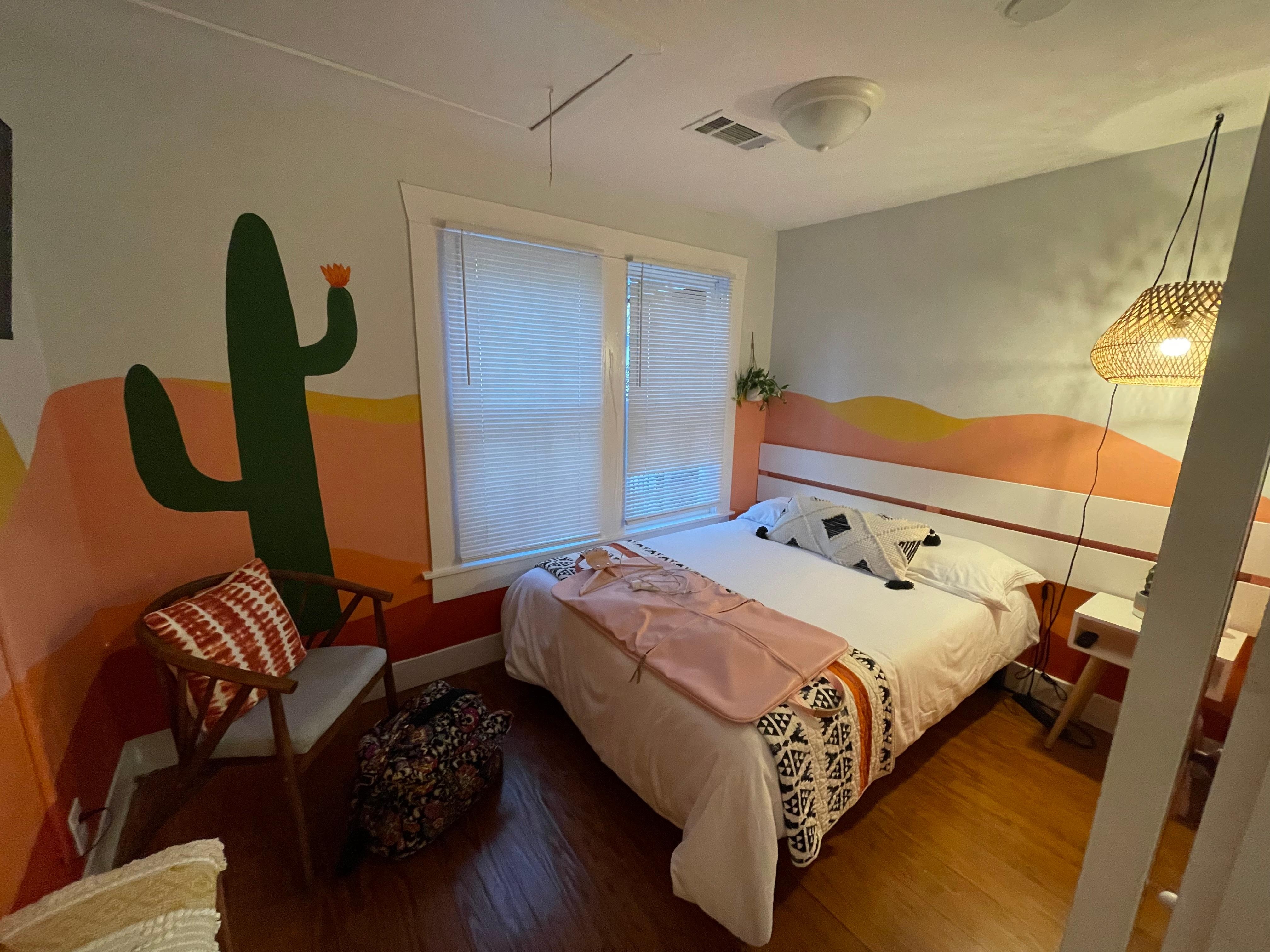 Hand Painted Mural surrounds this room with a little taste of West Texas! The room features a double bed with lots of color and style.