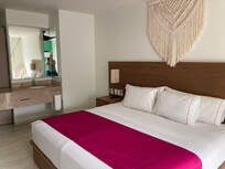I really wanted like this place but it makes it hard on itself. Price is reasonable which tempered expectations from the start I was prepared for small inconvenience..We had a suite with a king bed the room was spacious and had 2 nice big TV with netflix, the AC worked good and the bed was pretty comfortable Mauricio at the front desk was very nice and helpful ..Hot is not far from busy area about 5 min drive ...Thats where the positives end. The all inclusive is a joke food is nearly inedible. We saw a roach on the buffet and kitchen staff was very unclean seen the "chef wiping sweat off his head then grabbing nacho chips and throwing them on a plate for guest. All the left overs get turned into a goulash and keep getting reserved ..we tried a breakfast/lunch and dinner and that was it for 5 days .you can only get drinks at the top floor bar it was unmanned half the time and drinks were very diluted another waste ..The pool is TInY and cloudy 5 people vis crowded...Super stingy with towels and bad quality ..the were several huge spiders in our room . The toilet randomly stopped working for about half a day. The was a 4 x4 window in the "living room " missing the curtain so our room was exposed to the alley it was facing we were uncomfortable and they tied a bed sheet over the window FOR 5 DAYS. the front entrance to the hotel is decent but you park in the back it smells like sewage and has molding puddles of standing water . You go thru a corridor that looks abandoned