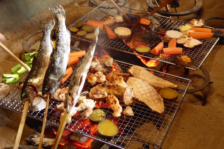 We will provide all cooking tools and materials: rice and wood for cooking; seasonal BBQ vegetables; salt-grilled yamame mountain trout.